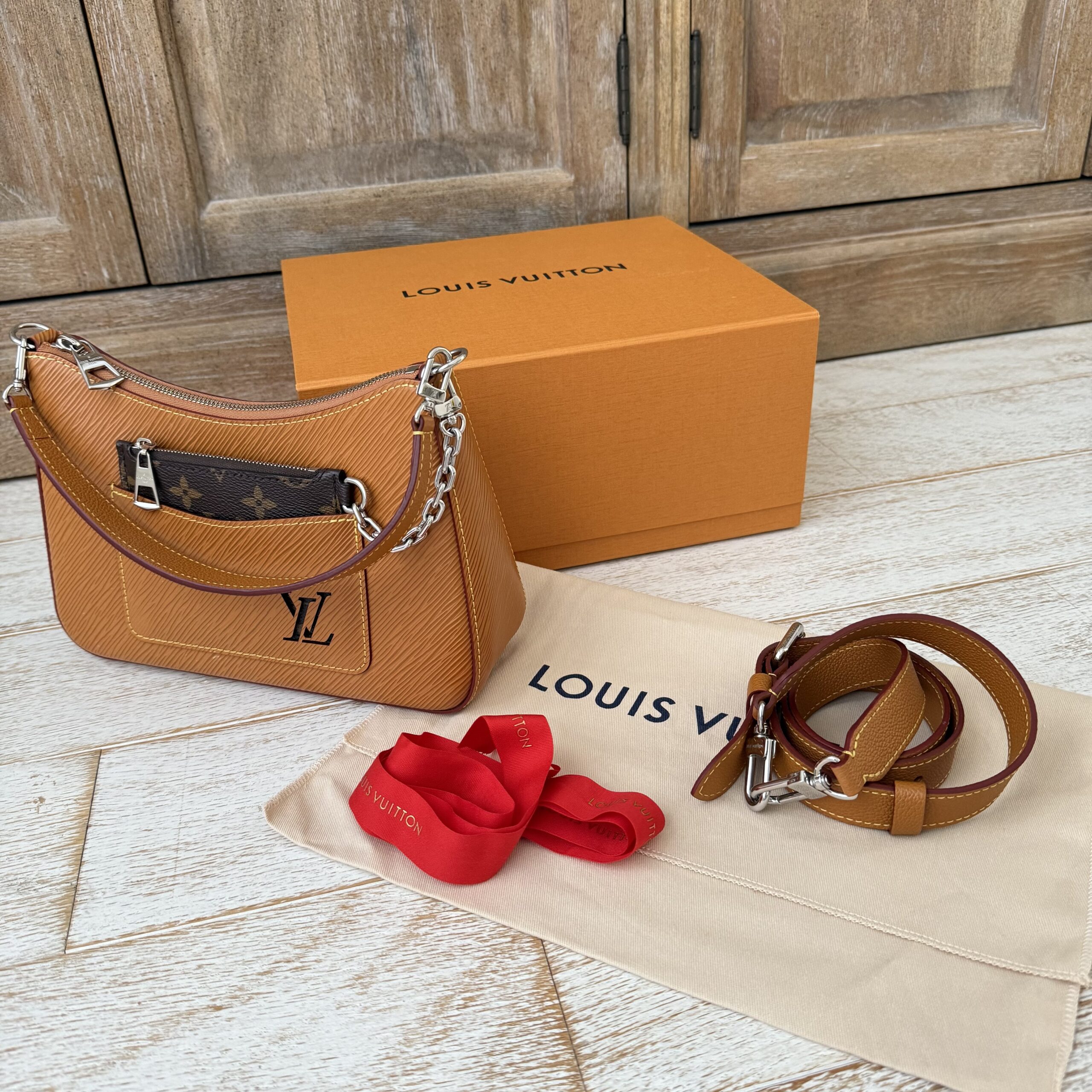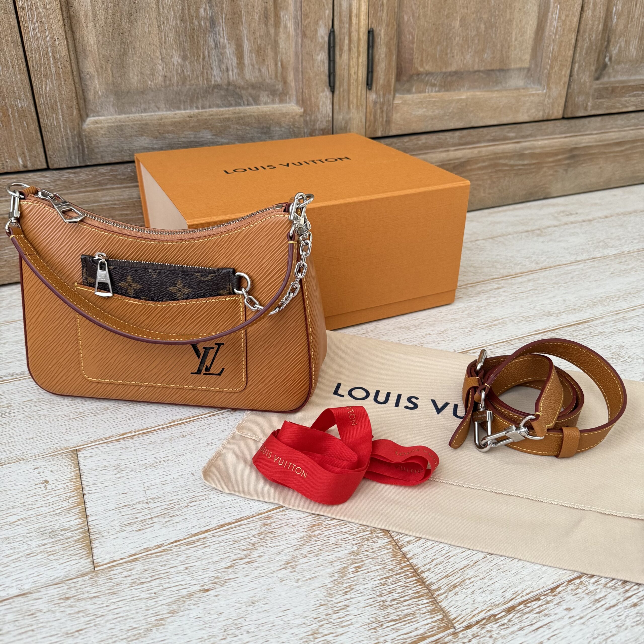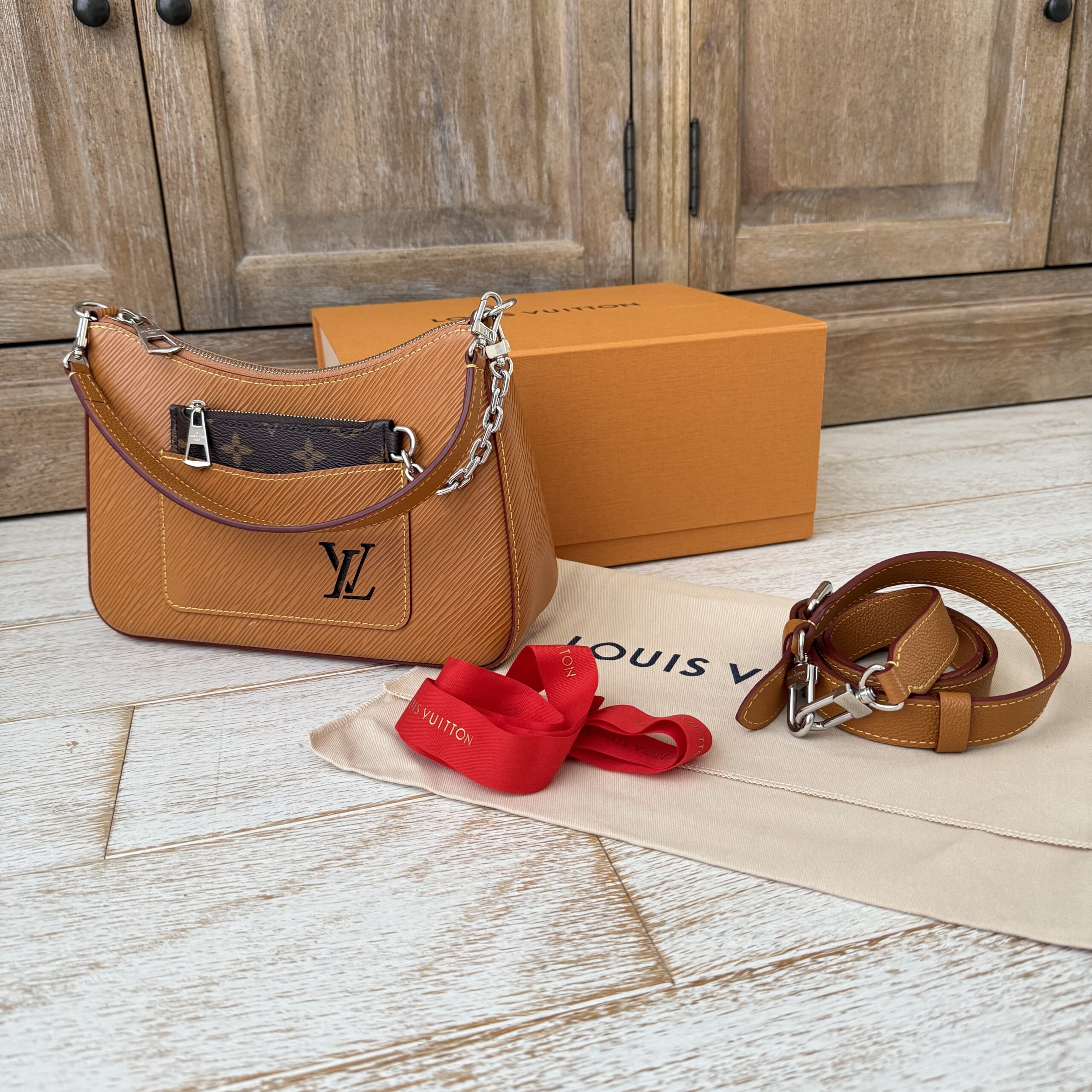 Louis Vuitton Epi Leather Marelle in Honey Gold. Features grained epi leather with removable monogram zippered pouch, silver-toned hardware, zip closure, detachable short strap and detachable/adjustable cross-body strap in grained calf leather. Microfiber lining with flat pocket. Measures approx. 9.8” x 5,9” x 3.1”. Made in France. Microchipped. This bag is in new condition and comes with box, dust cover and ribbon.