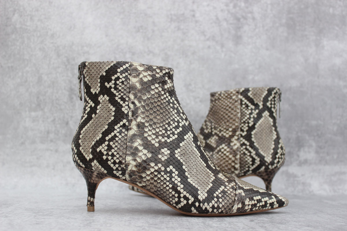 Alexandre Birman Python Kittie Booties. Size 37. These have a pointed toe, 2″ kitten heel and a back zip. Made in Brazil. There is wear on the bottom soles. Light wear on the interior soles. No box.