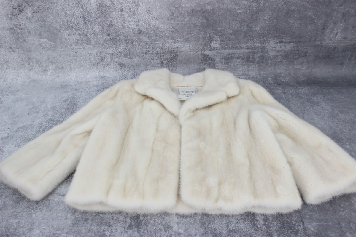 A stunning, glamorous, red carpet white mink jacket by Badgley Mischka. Dyed mink. Made in U.S.A. Features 3/4 length sleeves, a boxy body and a shorter length. Open at the front. The bottom hits at hip bone approximately. Fully lined. The lining has a hidden pocket. Measurements: length 24″, sleeve 18.5″, shoulder to shoulder 18.5″, bust 38″. This jacket is in perfect condition and looks unworn.