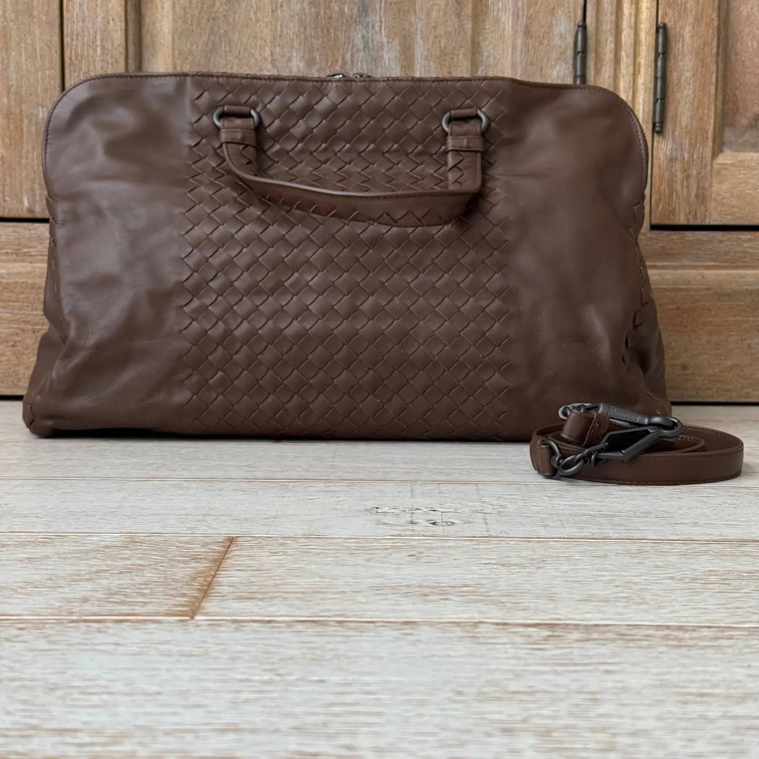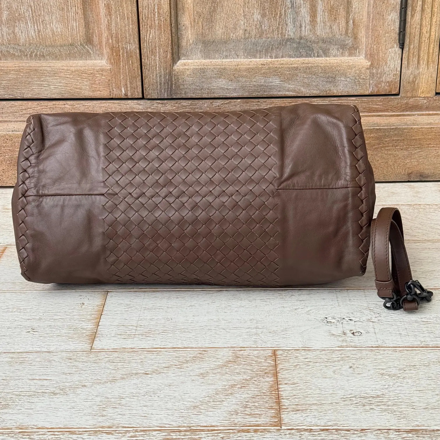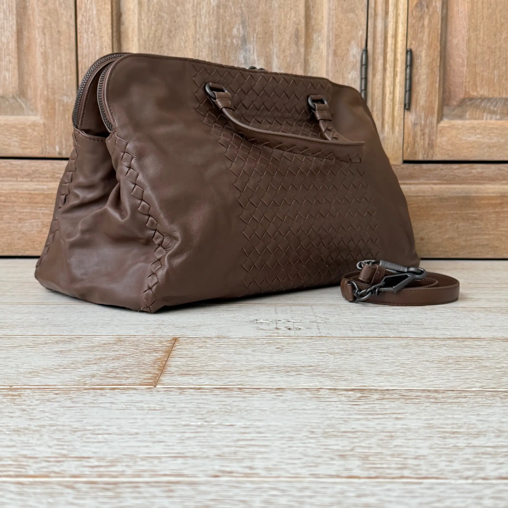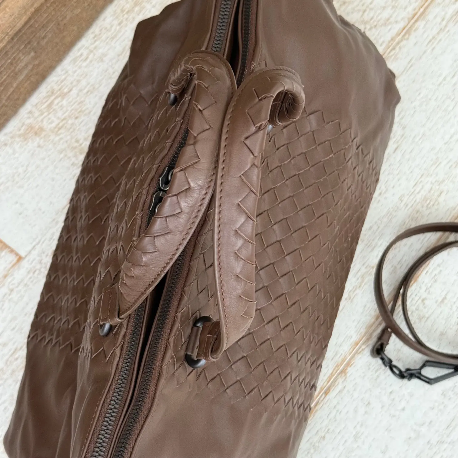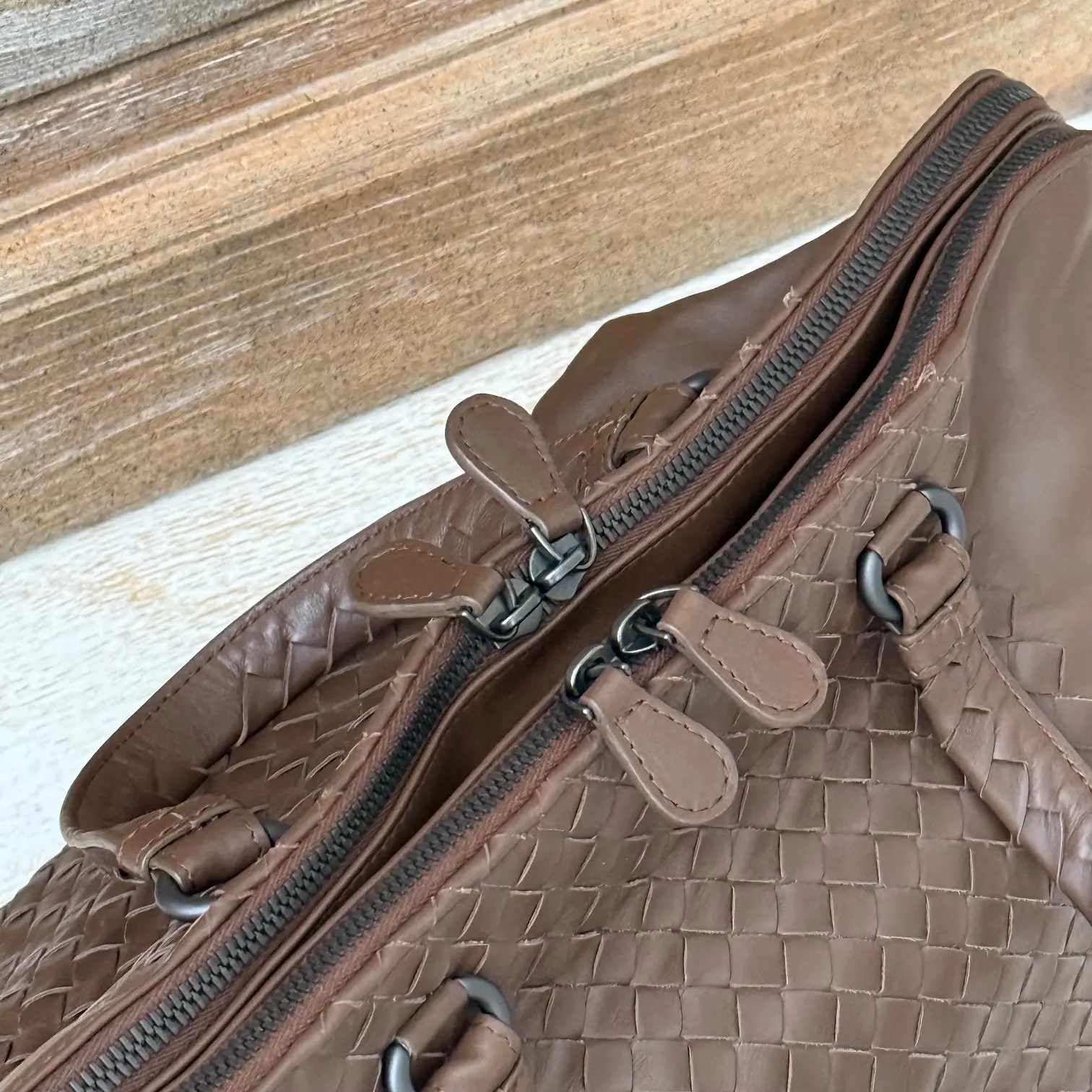 Bottega Veneta Large Leggero Bag. This multicompartment soft leather bag features a mix of smooth and intrecciato leather, gunmetal hardware, double intrecciato handles, detachable shoulder strap, two zippered compartments, a center compartment with hidden magnetic closures and a small open pocket in the center. There is a cell phone pocket inside one of the zippered compartments. Tonal suede lining. Measures approx. 15″ across the base x 10″ x 7.5″. Made in Italy. Like new condition. No dust cover.