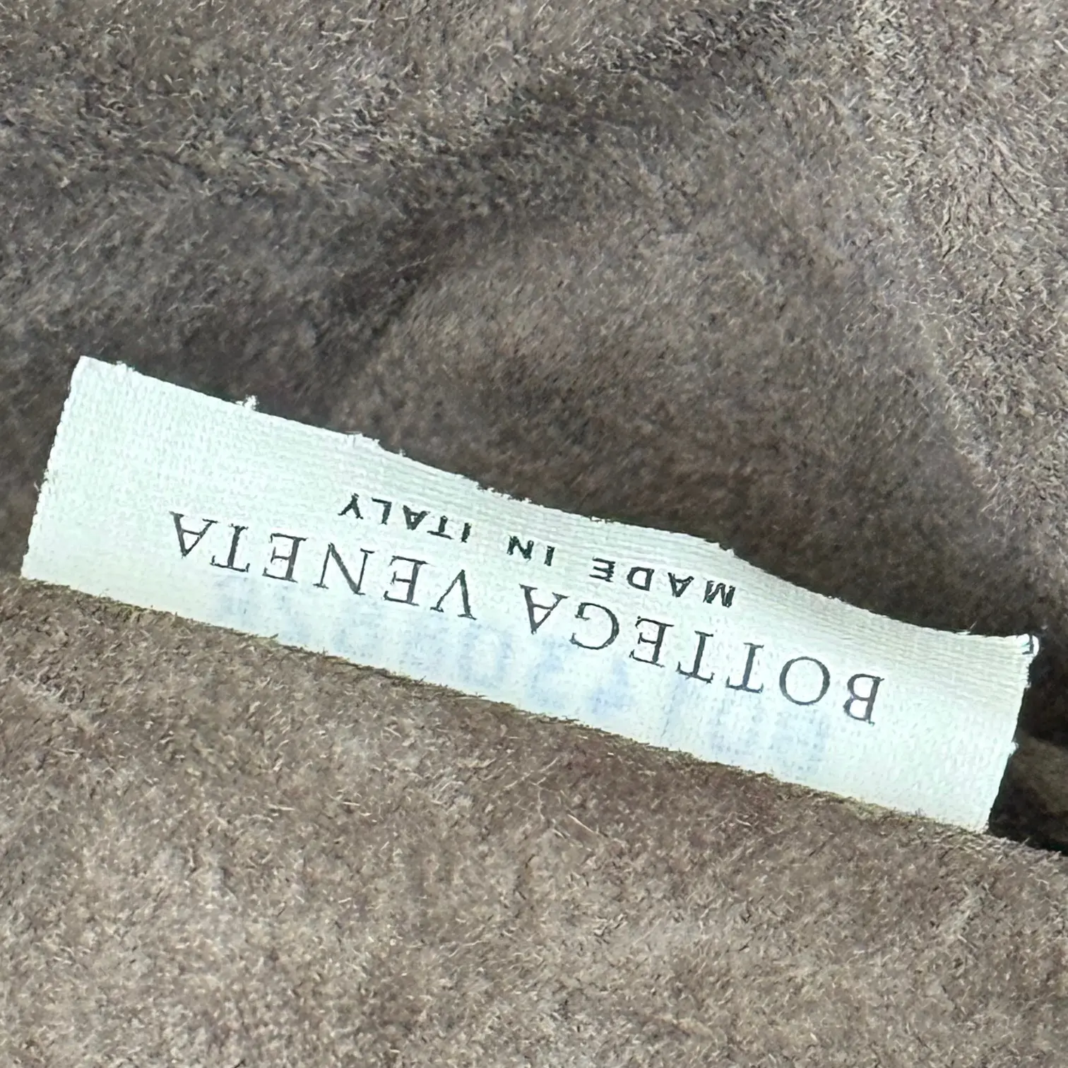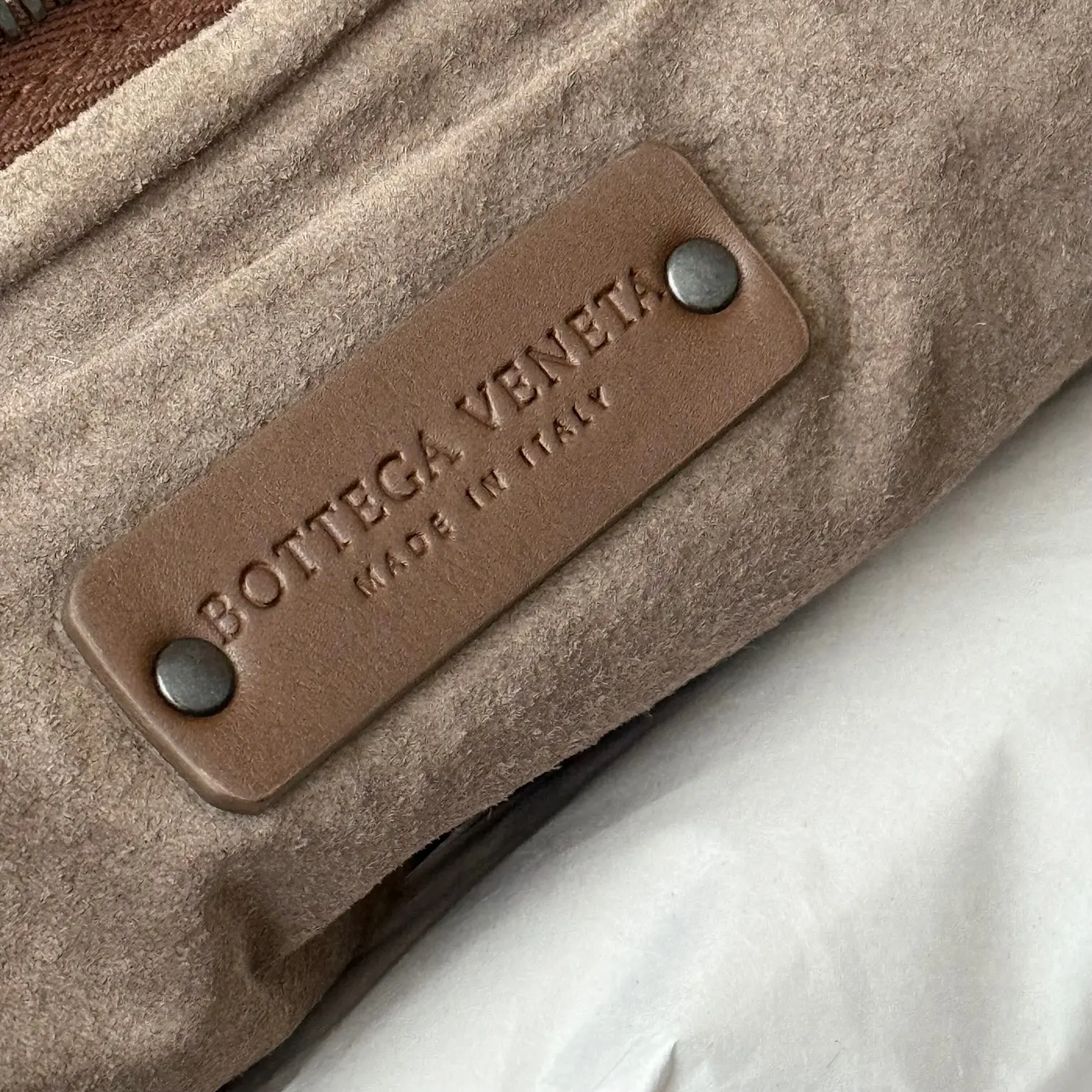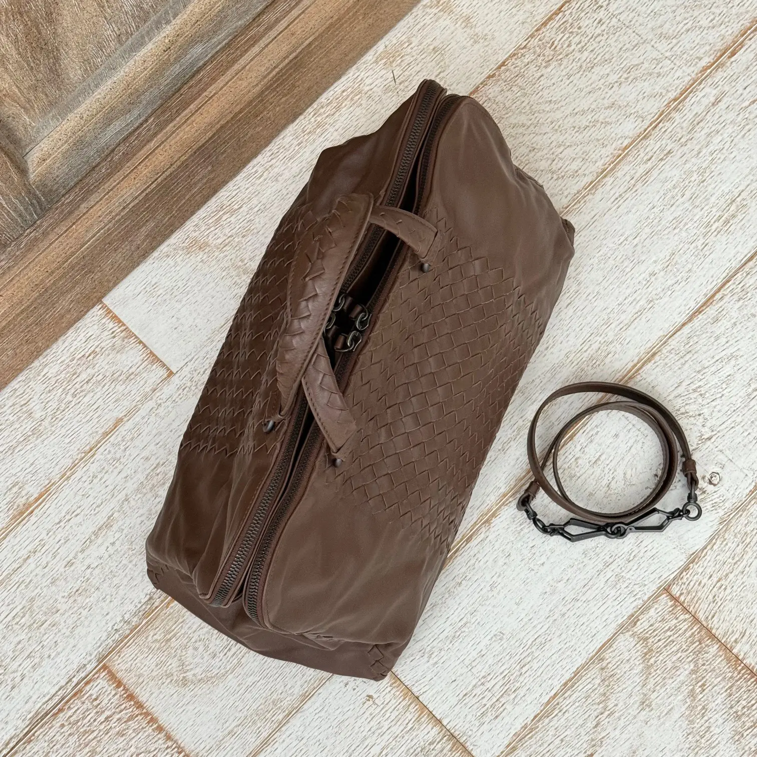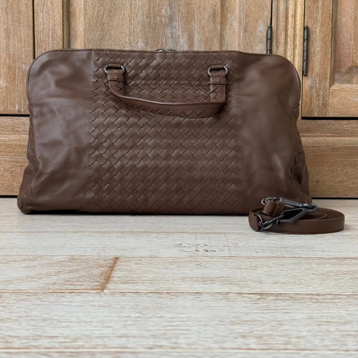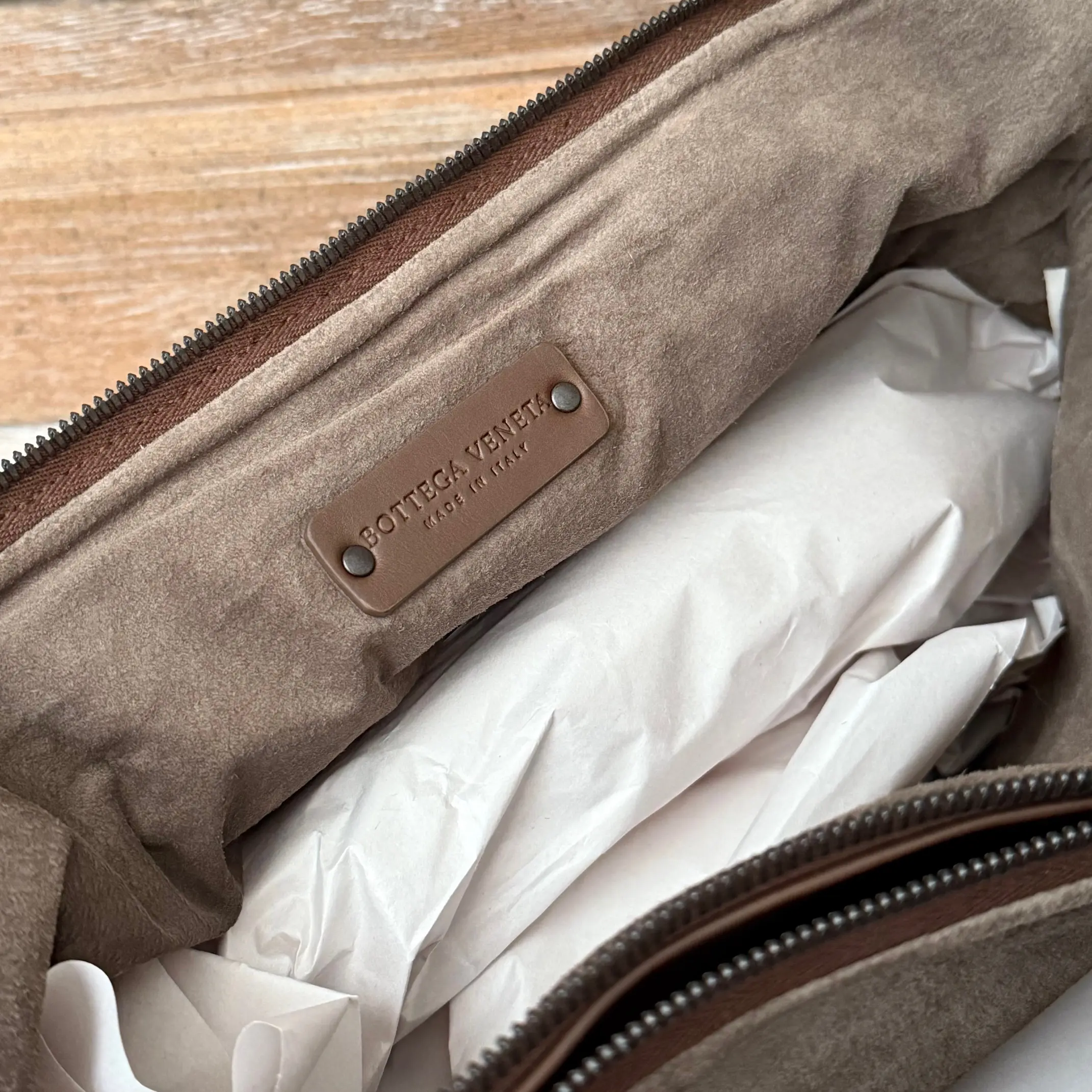 Bottega Veneta Large Leggero Bag. This multicompartment soft leather bag features a mix of smooth and intrecciato leather, gunmetal hardware, double intrecciato handles, detachable shoulder strap, two zippered compartments, a center compartment with hidden magnetic closures and a small open pocket in the center. There is a cell phone pocket inside one of the zippered compartments. Tonal suede lining. Measures approx. 15″ across the base x 10″ x 7.5″. Made in Italy. Like new condition. No dust cover.