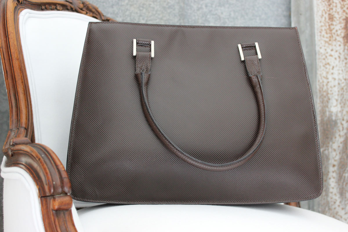 Bottega Veneta Vintage Pressed Leather Tote Bag. This bag features brown pressed leather and matte silver-tone hardware. It has double handles with 6.5″ drop to top of bag and an interior magnetic snap closure. Signature Bottega Veneta woven lining with zippered pocket. This bag has never been carried. We do not have the dust cover. Serial/Style: 10700307028CS 9G00041768G616 971258.Measures 13 1/4″ x 9.75″ x 4.5″ (please see measurements as the bag may appear larger in the photos). This bag makes a great work bag. It’s soft-sided but has a structured, sophisticated look to it. It fits an Ipad and other accessories nicely. Made in Italy.