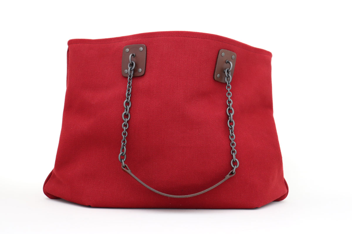 Bottega Veneta Red Canvas Tote Bag. Features thick cotton canvas with gunmetal chain straps, brown leather trim, an open top and roomy interior. The straps have an 8.5″ drop to top of bag. Measures approx. 18″ across the top x 12″ down the center x 8″ deep. Made in Italy. In excellent condition. Comes with cards and dust cover.
