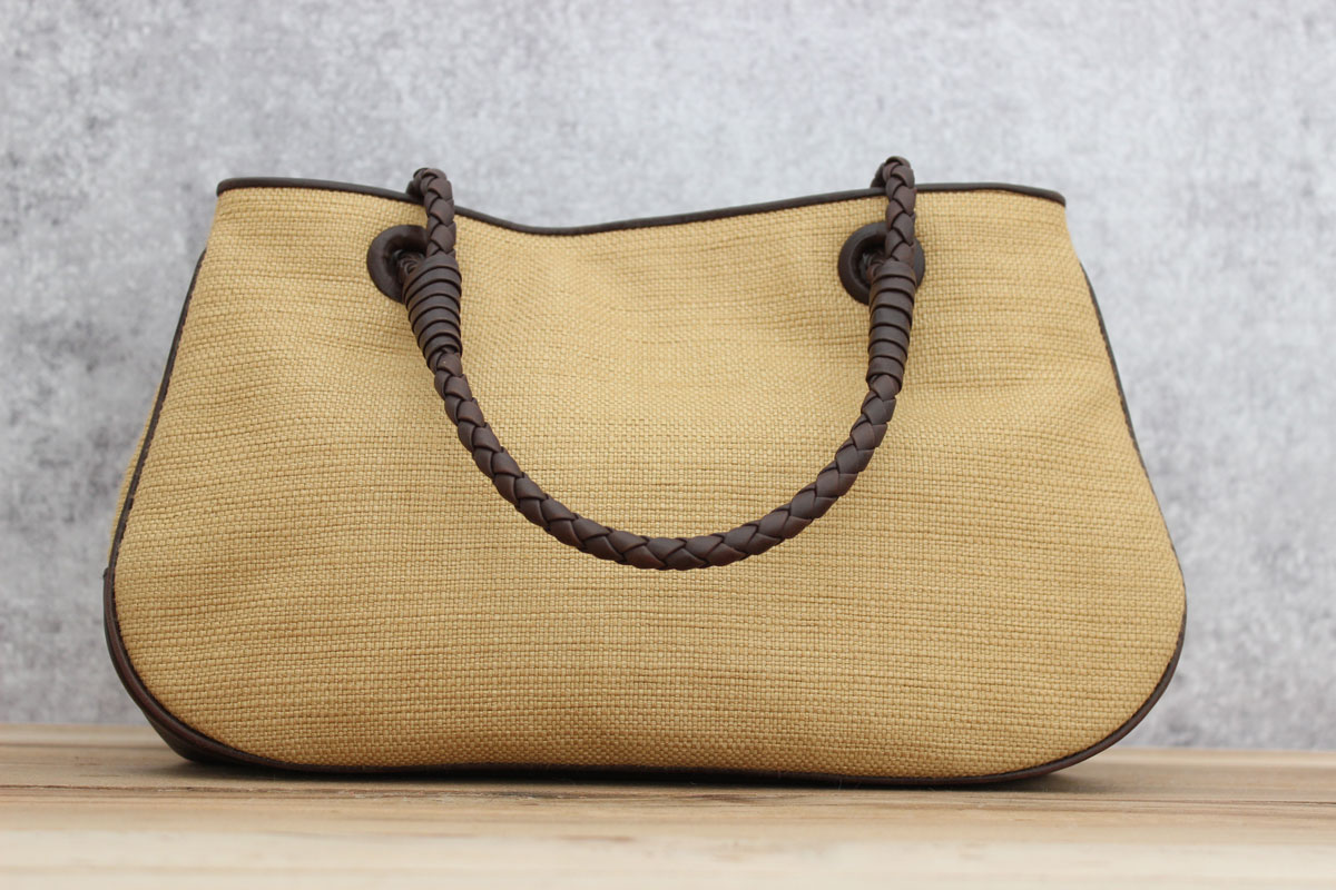 Bottega Veneta Natural Jute Burlap Satchel. Features natural jute burlap with dark brown leather trim and braided leather handles with 5″ drop. Interior magnetic snap closure. Suede lining with center zippered compartment and zippered pocket. Measures 12″ at widest, x 7″ x 6.25″. Made in Italy. This bag is in beautiful condition. There are five “age” spots on the jute burlap which is a natural fabric. I don’t know if the spots can be removed (see photos). It is otherwise immaculate inside and out and comes with dust cover.