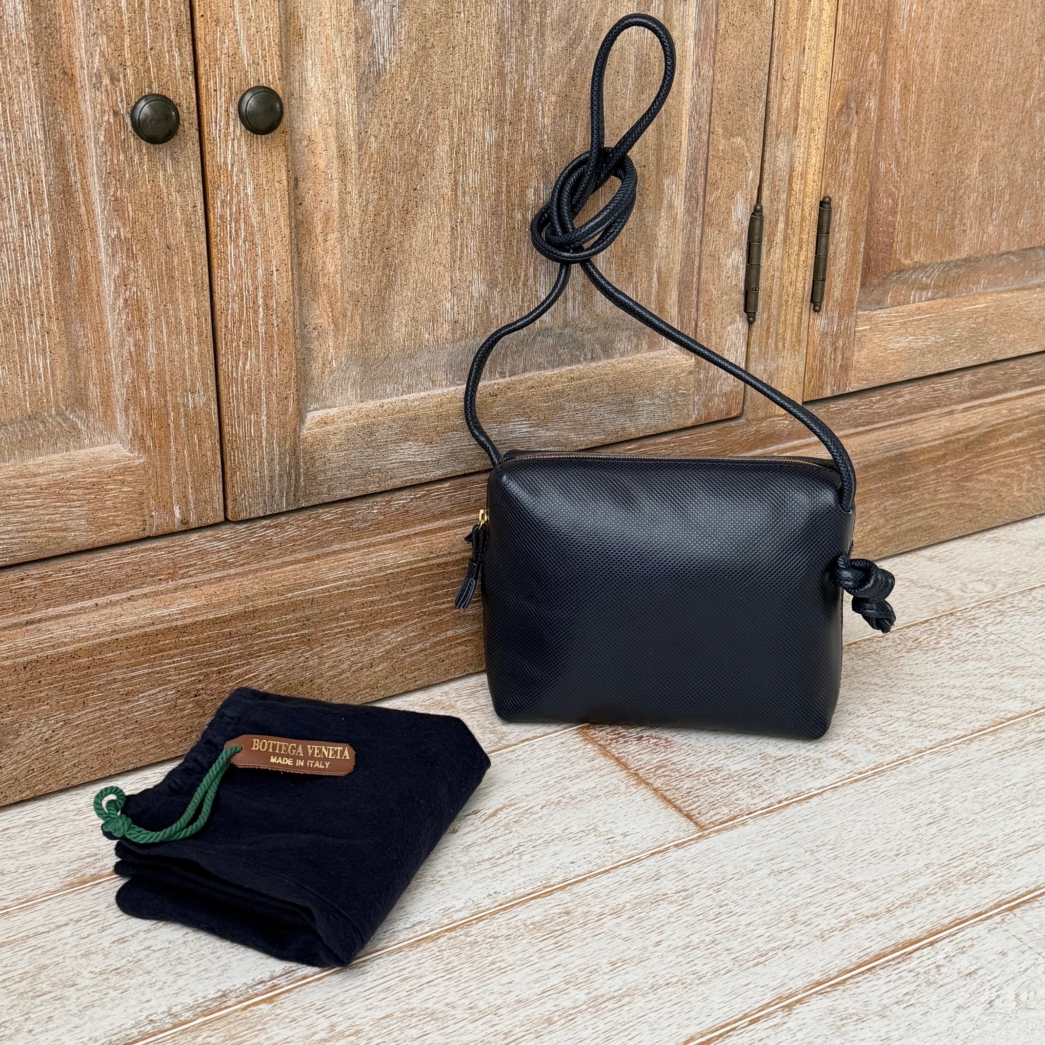 Bottega Veneta Vintage Navy Blue Nodini Bag. Navy blue leather with zip closure and adjustable knotted strap. Can be shortened to wear on the shoulder or lengthened to wear cross-body. Woven textile lining with zippered pocket. Measures approx. 8″ x 7″ x 2.5″. Made in Italy. This bag is in like new condition and comes with dust cover.