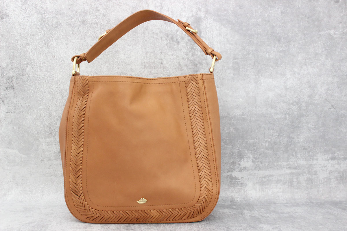 Brahmin Southcoast Eva Leather Tote. Tan Knoxville. Smooth leather with woven leather accents, hidden magnetic closure, single leather shoulder strap, exterior slip-in pocket and woven lining with two slip-in pockets, one pen pocket, one zippered pocket and key clip. Measures 13.5″ x 15″ x 4″. Adjustable straps have 7-8″ drop. Made in China. This bag has been gently carried is in excellent condition with dust cover.