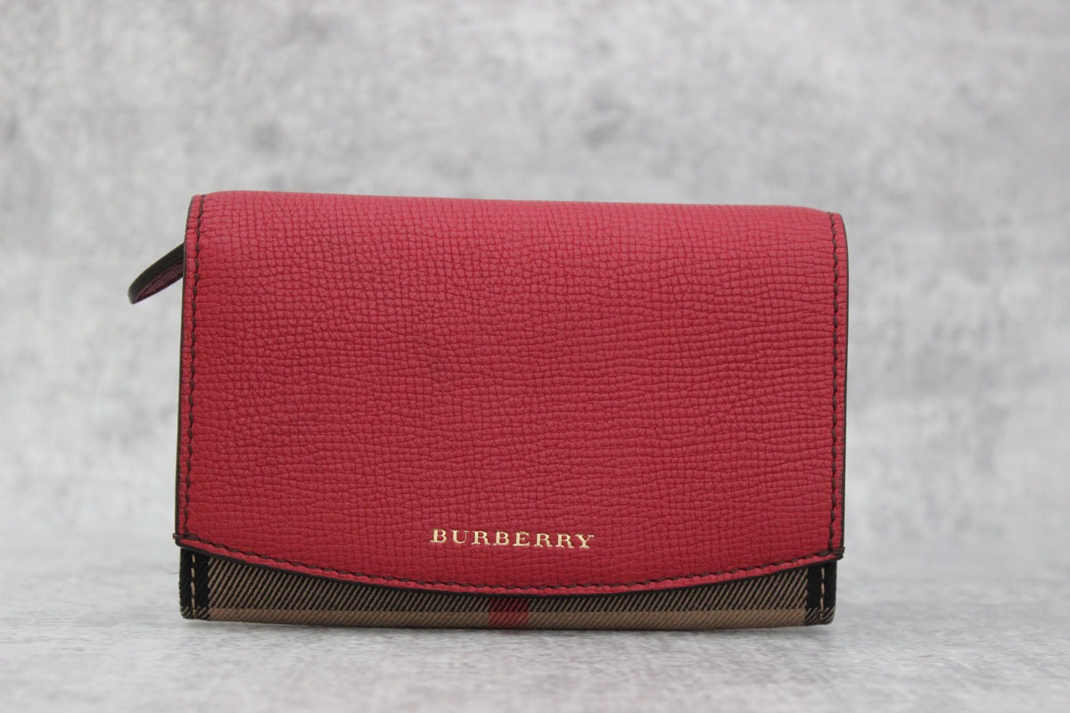 Burberry Wellington Red Leather & House Check Wallet. Snap closure, seven total card slots, two slip-in pockets, bill compartment and zippered change compartment. Measures 5.75″ x 3.5″ x 1.25″. Made in Italy. Serial/Authenticity: ITALBSRL239CAL. Very good condition. Comes with dust cover.