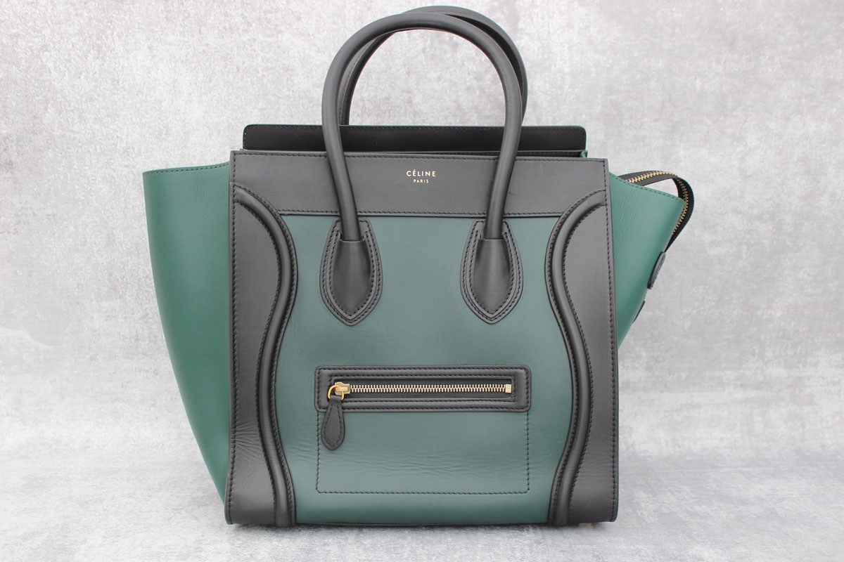 Celine Green/Black Smooth Calfskin Mini Luggage Tote. Measures 12″ x 12″ x 7″. Made in Italy. Serial/Authenticity: W AT 0173 W CU 0183. There are some very light scratches but this bag is in excellent condition and doesn’t look like it was carried more than a few times. Comes with dust cover.