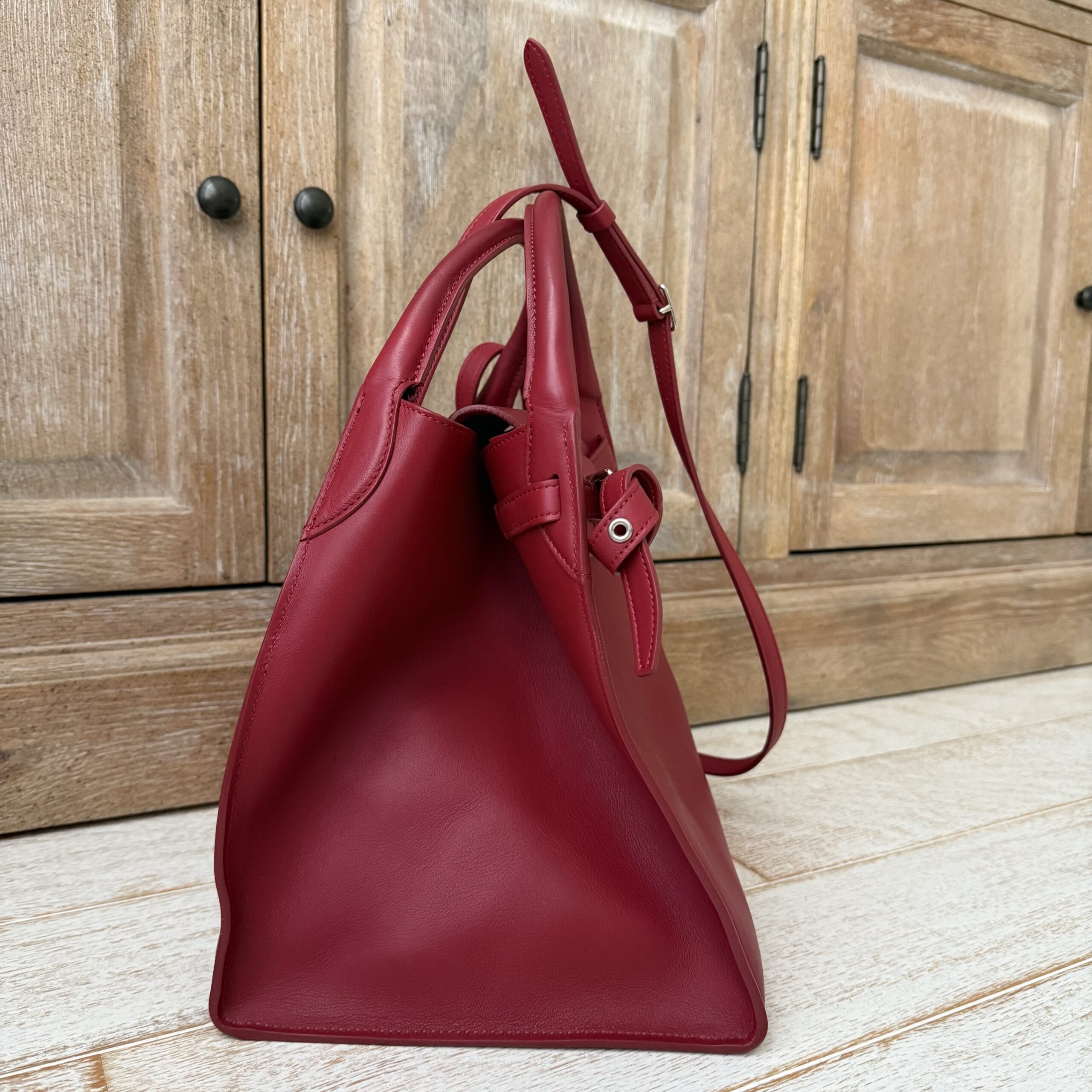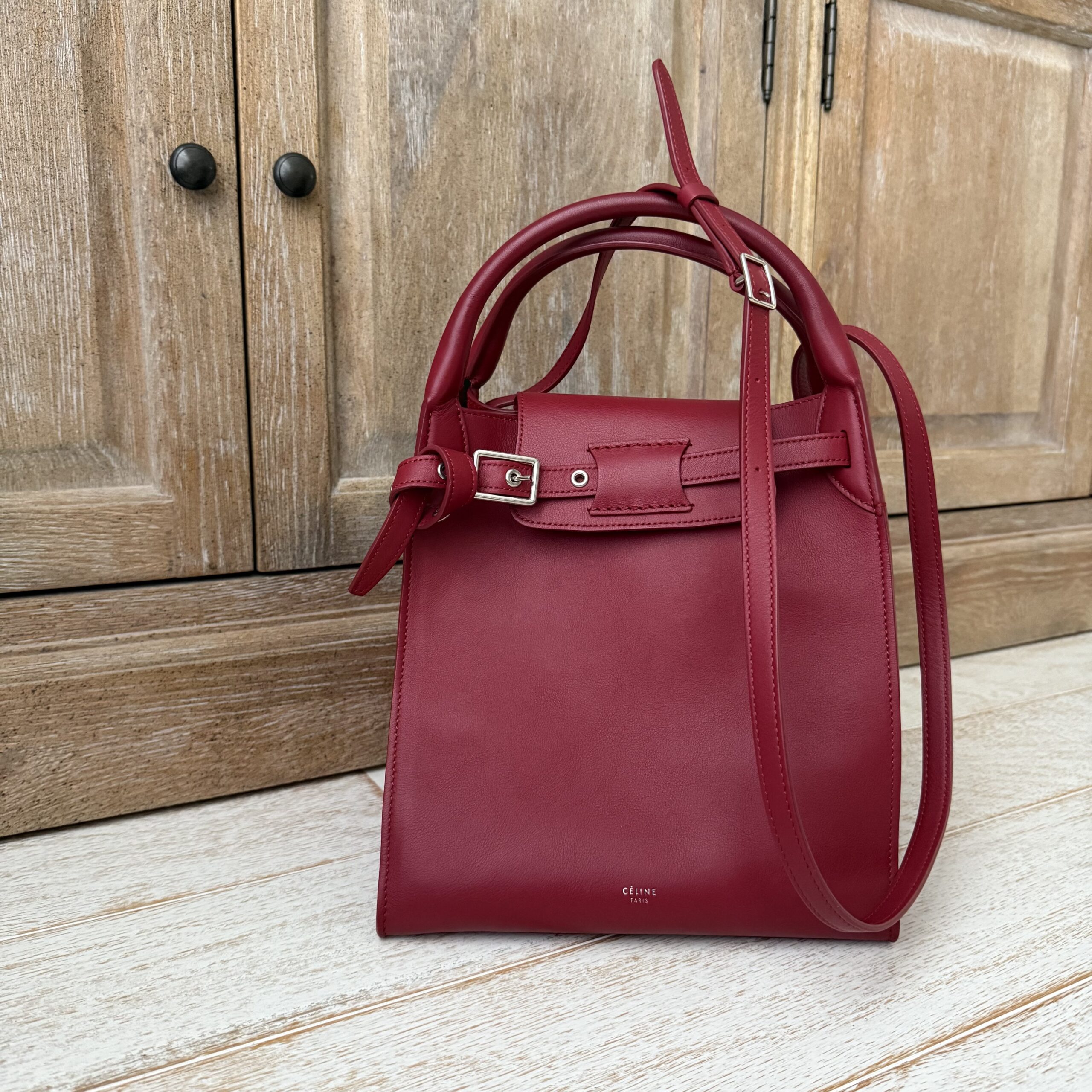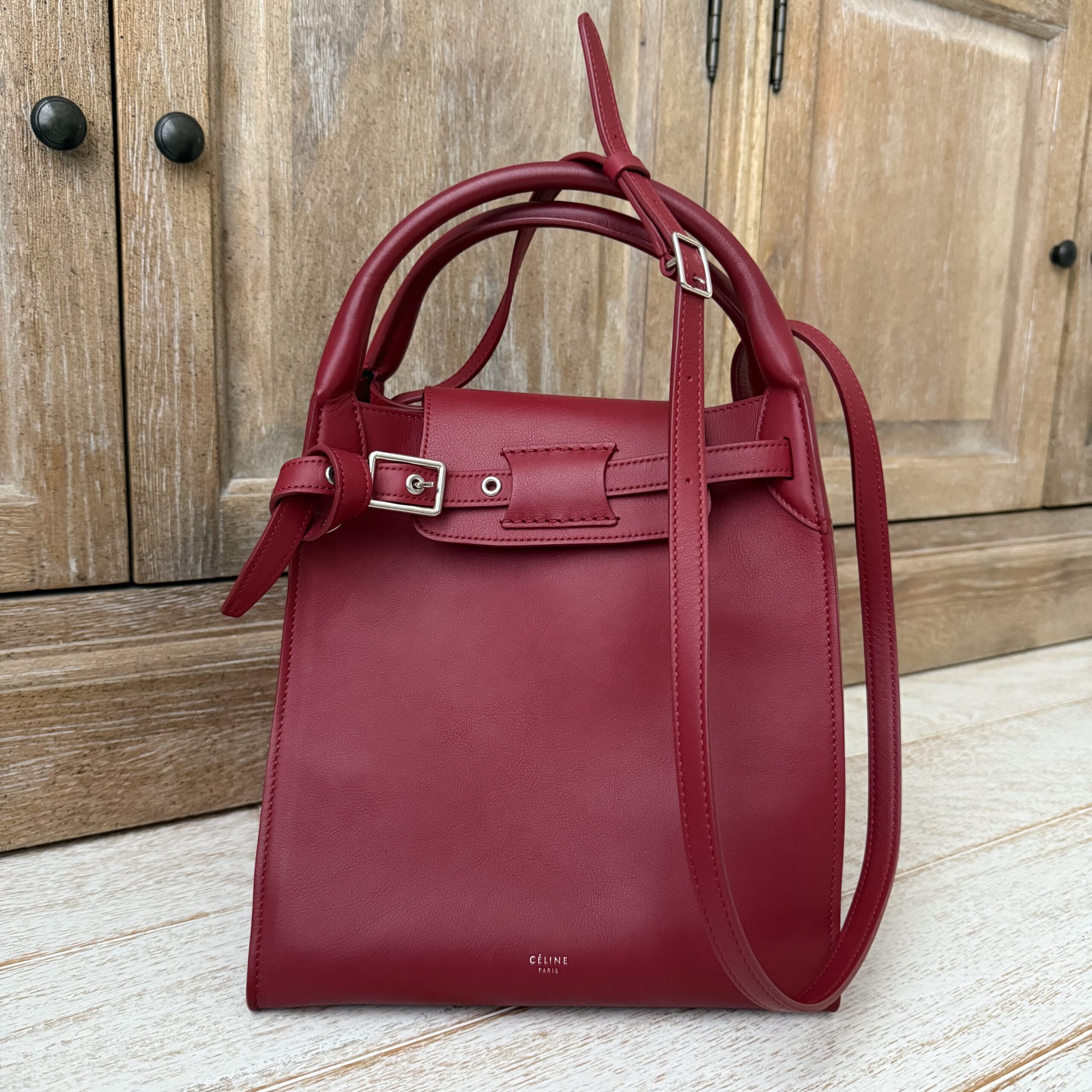 Celine red smooth calfskin small Big bag. Smooth calfskin leather with polished silver-toned hardware, belt and buckle detailing, double handles, adjustable strap to carry on the shoulder or crossbody, interior hook closure and red suede lining with zippered pocket. Measures 9.5” across base, 17.5” across the top when side flaps are fully extended, 10.5” tall x 8.5” deep. Made in Italy. Serial: W CU 2188. This bag is in pristine condition and comes with dust cover.