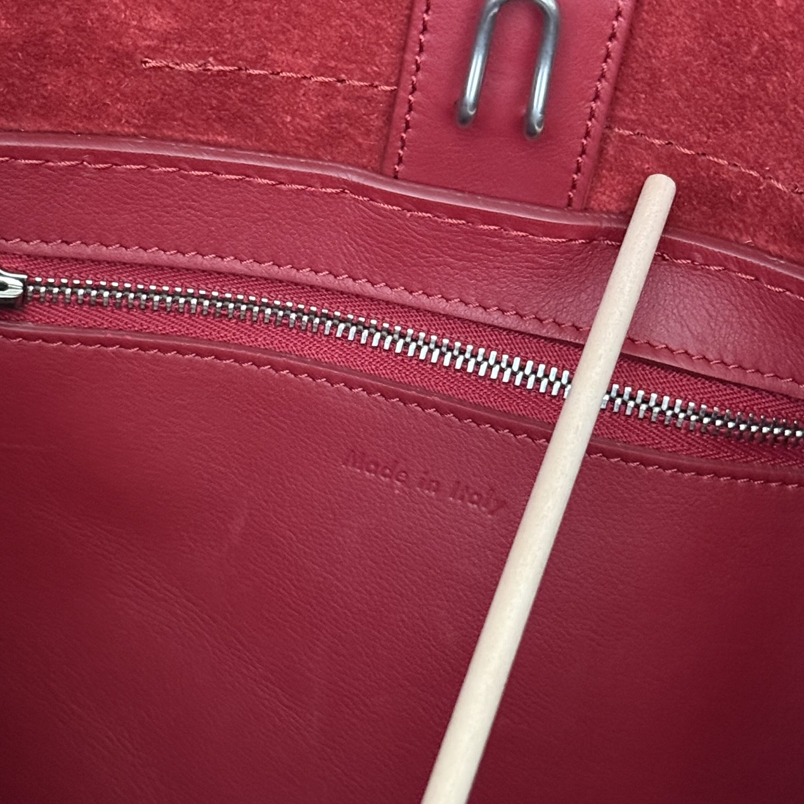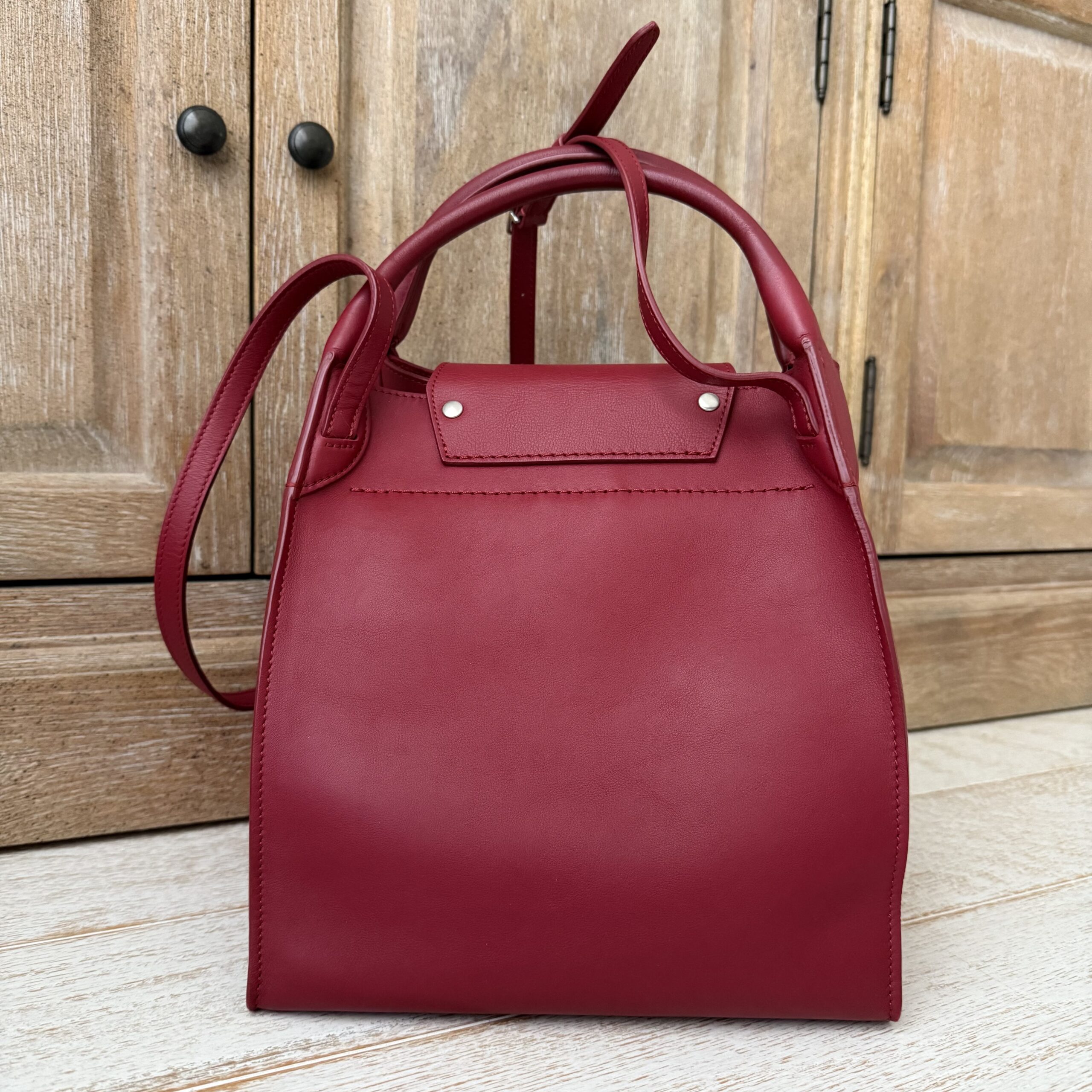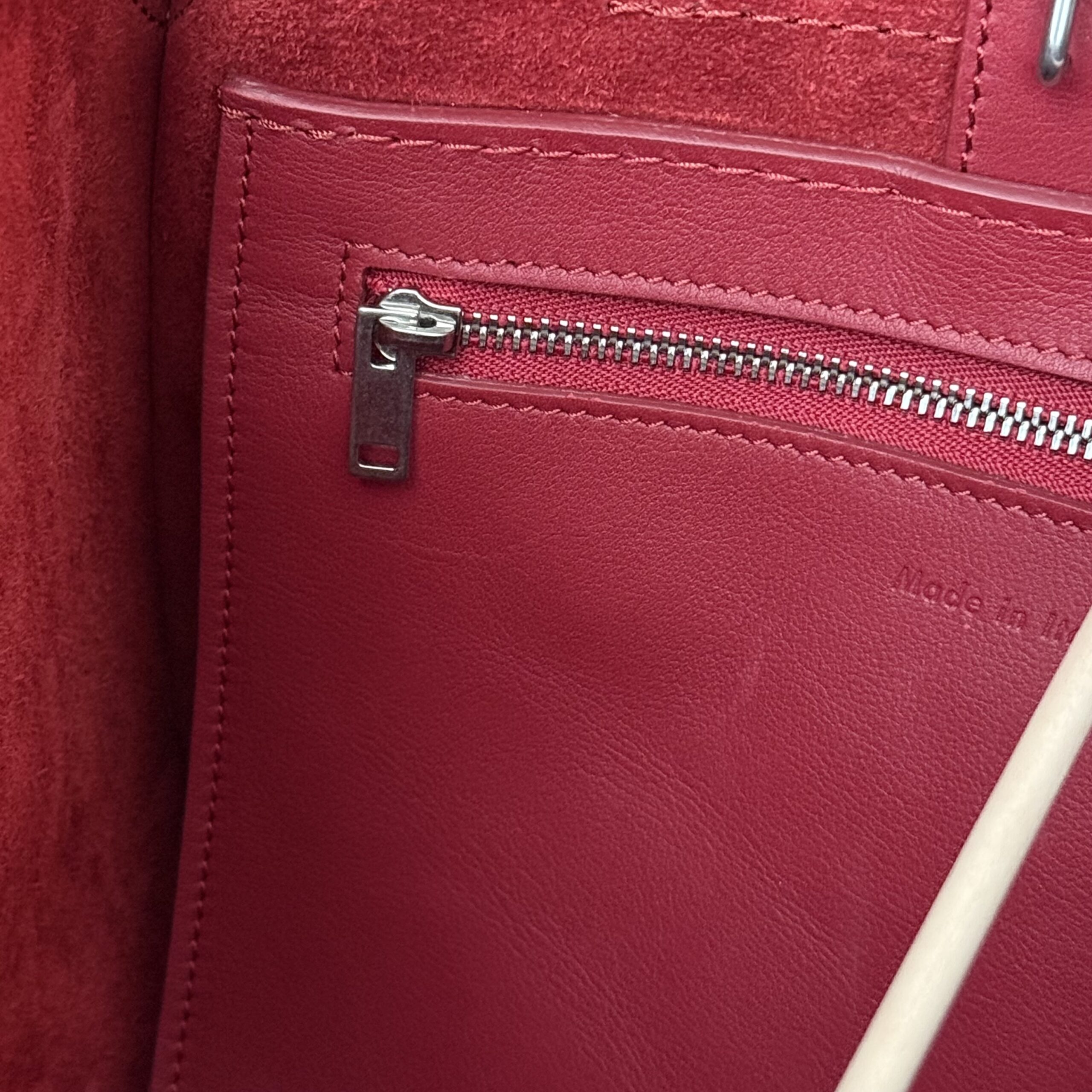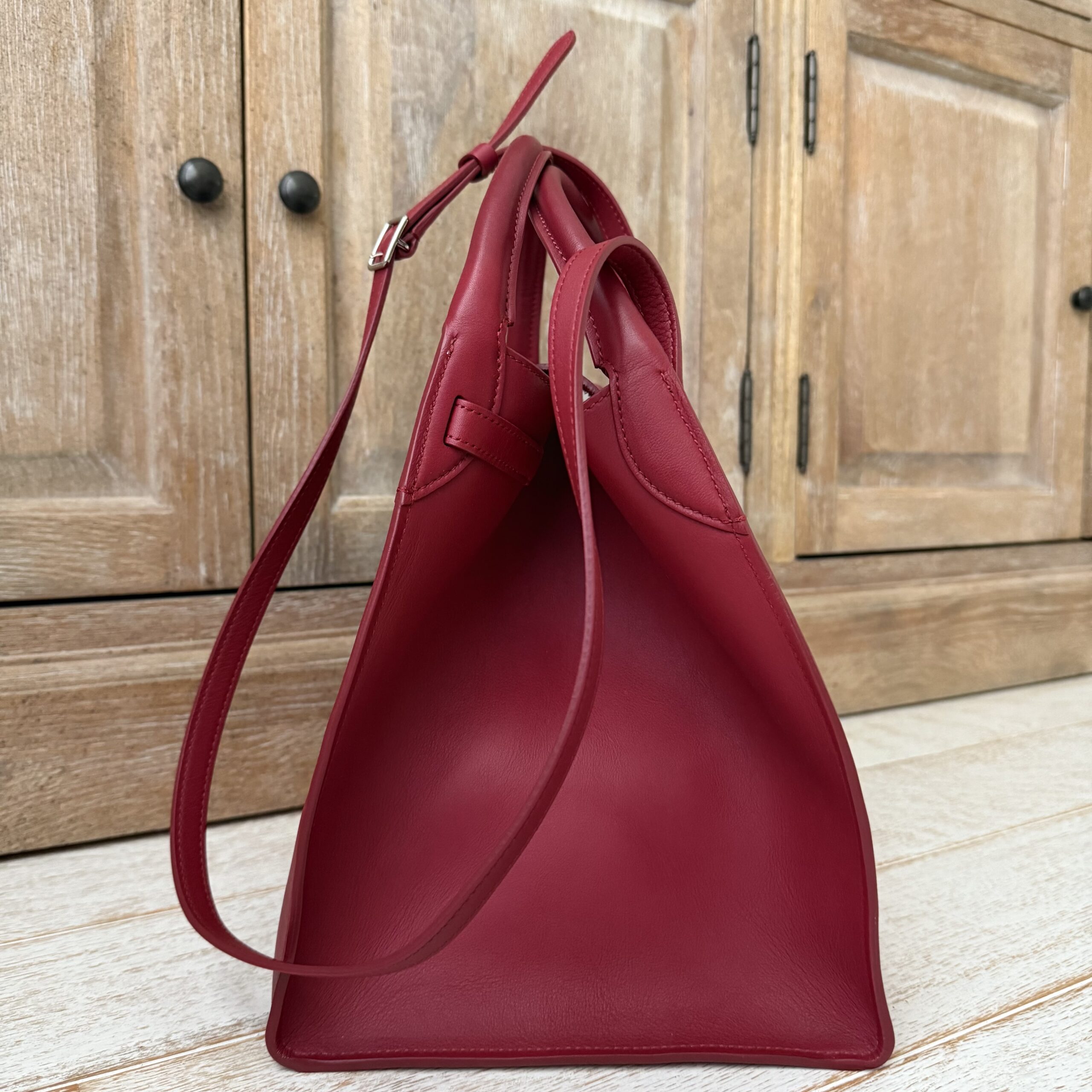 Celine red smooth calfskin small Big bag. Smooth calfskin leather with polished silver-toned hardware, belt and buckle detailing, double handles, adjustable strap to carry on the shoulder or crossbody, interior hook closure and red suede lining with zippered pocket. Measures 9.5” across base, 17.5” across the top when side flaps are fully extended, 10.5” tall x 8.5” deep. Made in Italy. Serial: W CU 2188. This bag is in pristine condition and comes with dust cover.