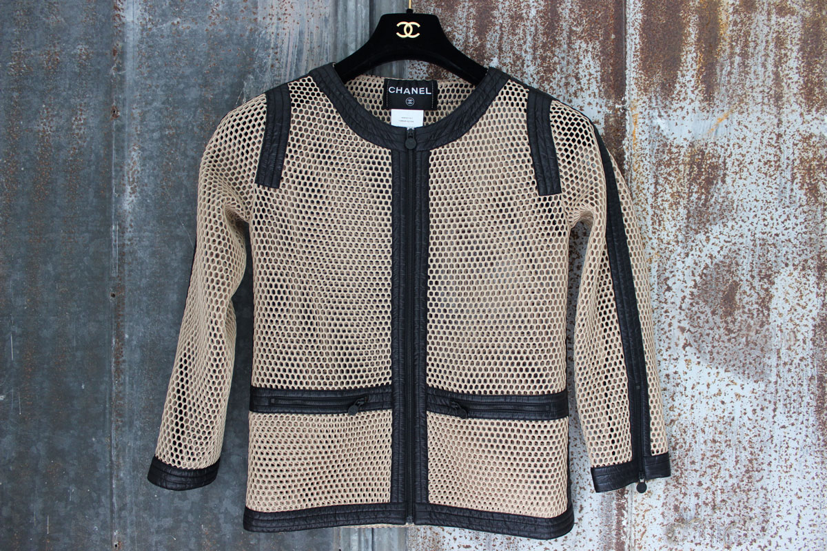 Chanel Beige & Black Perforated Jacket ~ Cardigan Sz. 36 ~ 4. Style:P48042V35860. Feels and looks like leather but it’s 100% polyester with nylon/poly insets. This jacket has never been worn. Features beige perforated polyester and black quilted nylon/polyester trim. Quilted leather effect on the trim. Black zipper detail with CC charm zipper pulls. Zips up the front. Made in Italy. 100% polyester. 2014 Resort Collection. Retail was $2,700.