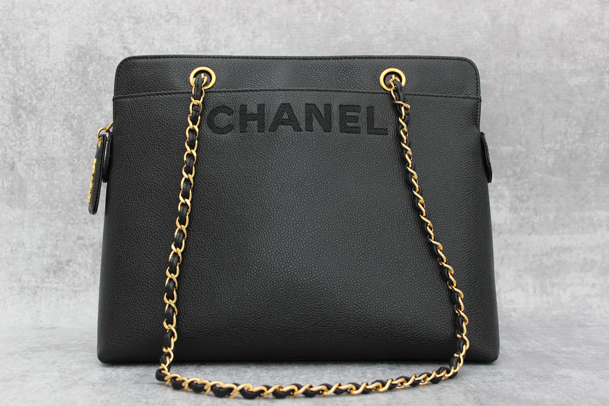 Chanel Black Caviar Leather Sac Shopping Shoulder Bag. This is the original Sac Shopping bag from Chanel. It is from 1998 and has never been taken out of the box until now. It still has its original tag attached, and comes with box, additional Nordstroms tag, booklet and authenticity card. No dust cover. It features black caviar leather, golden hardware, a zip-top closure with CHANEL lettering, CHANEL embossed at front, double chain straps with 12.5″ drop, front slip-in pocket and black textile lining with zippered pocket and two flat pockets. Hologram/Authenticity: 5488353. Measures 11.5″ x 9.5″ x 4″. Made in Italy.