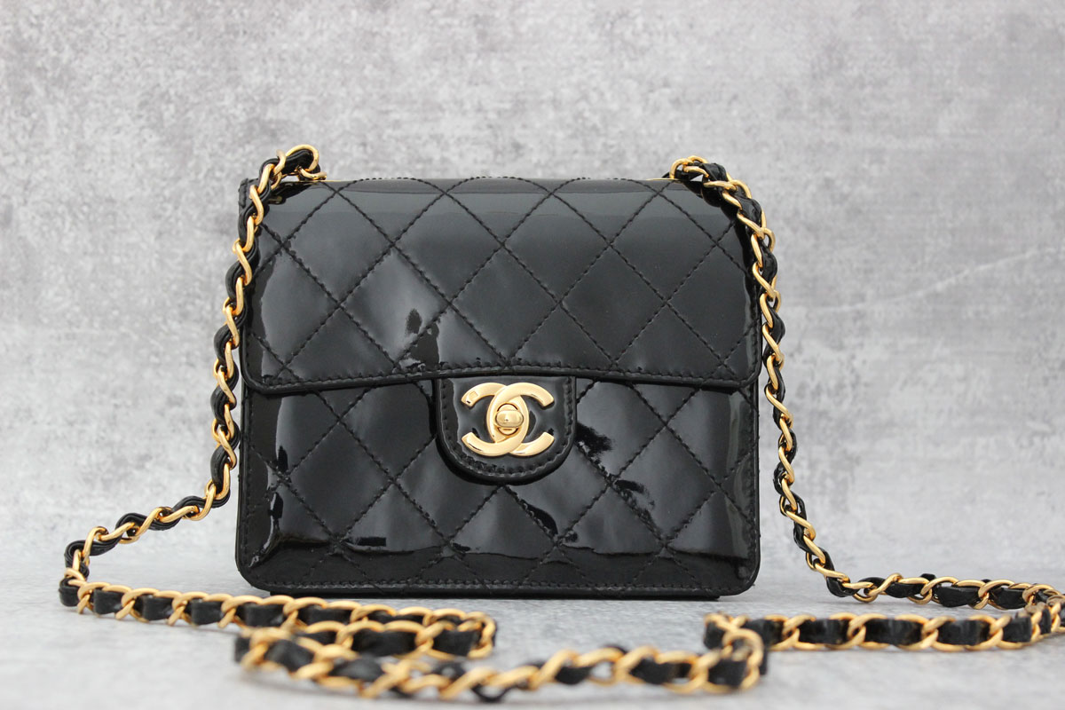 Chanel Black Patent Leather Mini Flap Bag. Patent leather, 24kt. gold-plated hardware, flap with CC turn-lock closure, leather and chain entwined strap with 20.5″ drop, back slip-in pocket on the exterior, leather lining with zippered pocket and slip-in pocket. Measures 6.5″ x 5″ x 2.5″. Made in France. Hologram 5221892. This bag is from 1997. It is in MINT, FLAWLESS condition and comes with dust cover, booklet and authenticity card.
