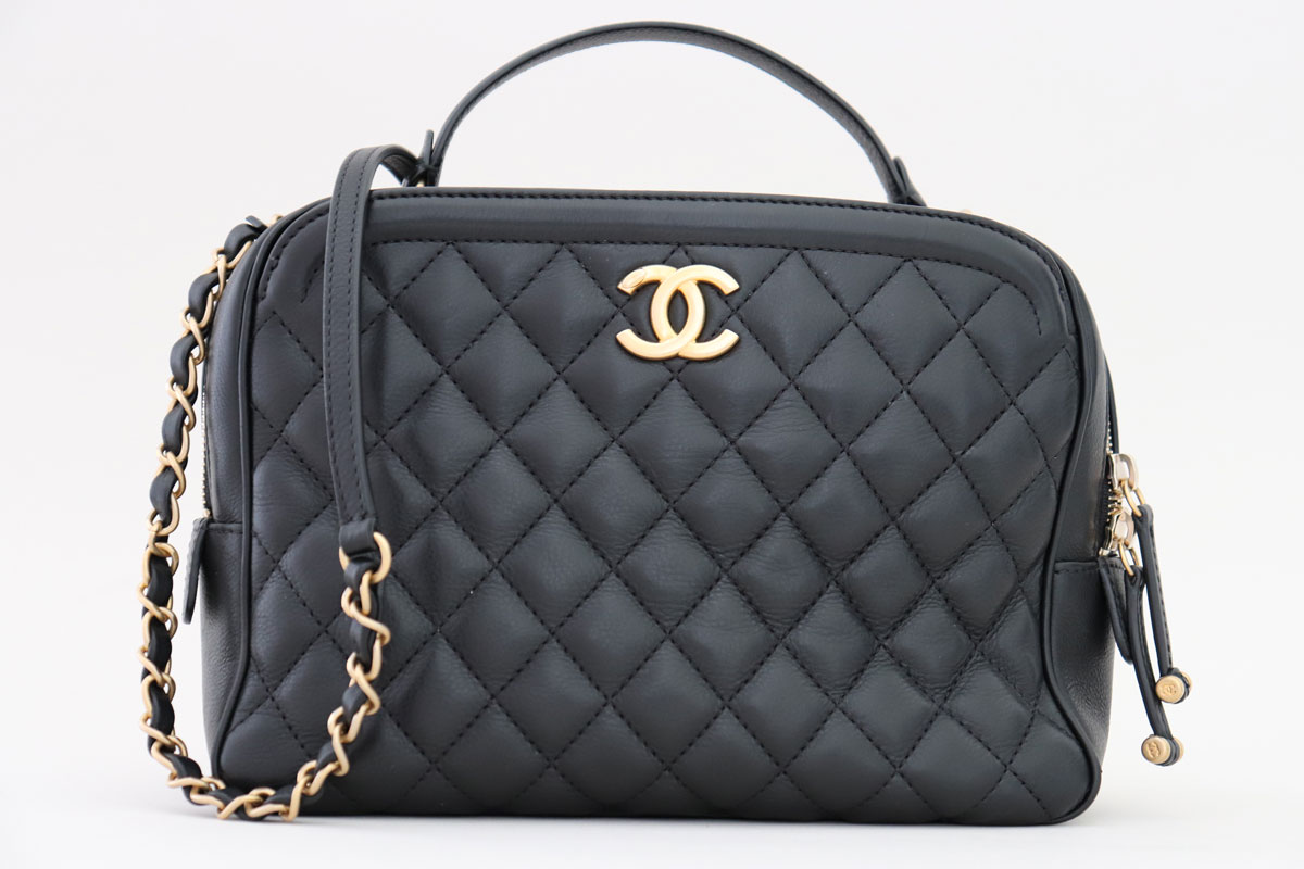 Chanel Black Quitled Calfskin Medium CC Vanity Case. Quilted calfskin, antiqued gold hardware, front compartment with magnetic snap closure, main zippered compartment with double zipper pulls and back magnetic snap compartment. Top handle and shoulder strap with 17.2″ drop to top of bag. Measures approx. 9.75″ x 7″ x 4″. Made in Italy. This bag is in very good condition but there are some light marks throughout including the interior. The hardware is excellent as are the bottom edges. Comes with dust cover.