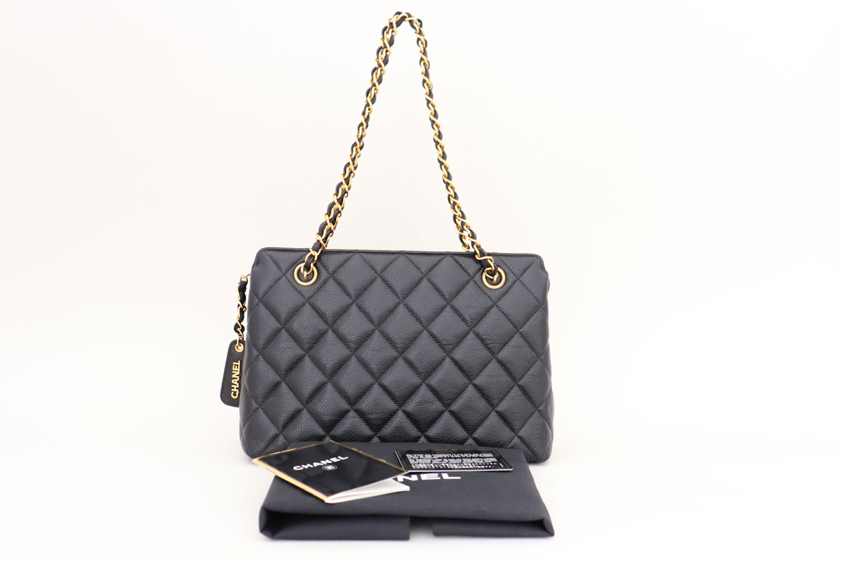 Chanel Black Quilted Caviar Leather Shoulder Bag. Features quilted caviar leather, gold-tone hardware, zip-top closure, Chanel lettering on both sides of the zipper pull and double chain straps with 9″ drop. The interior is lined in in black leather and has one zippered pocket and one flat pocket. Measures 10.5″ x 7.75″ x 4.25″. Made in France. Hologram/Authenticity: 4362877. This bag is in like new condition. Comes with dust cover, booklet and authenticity card.