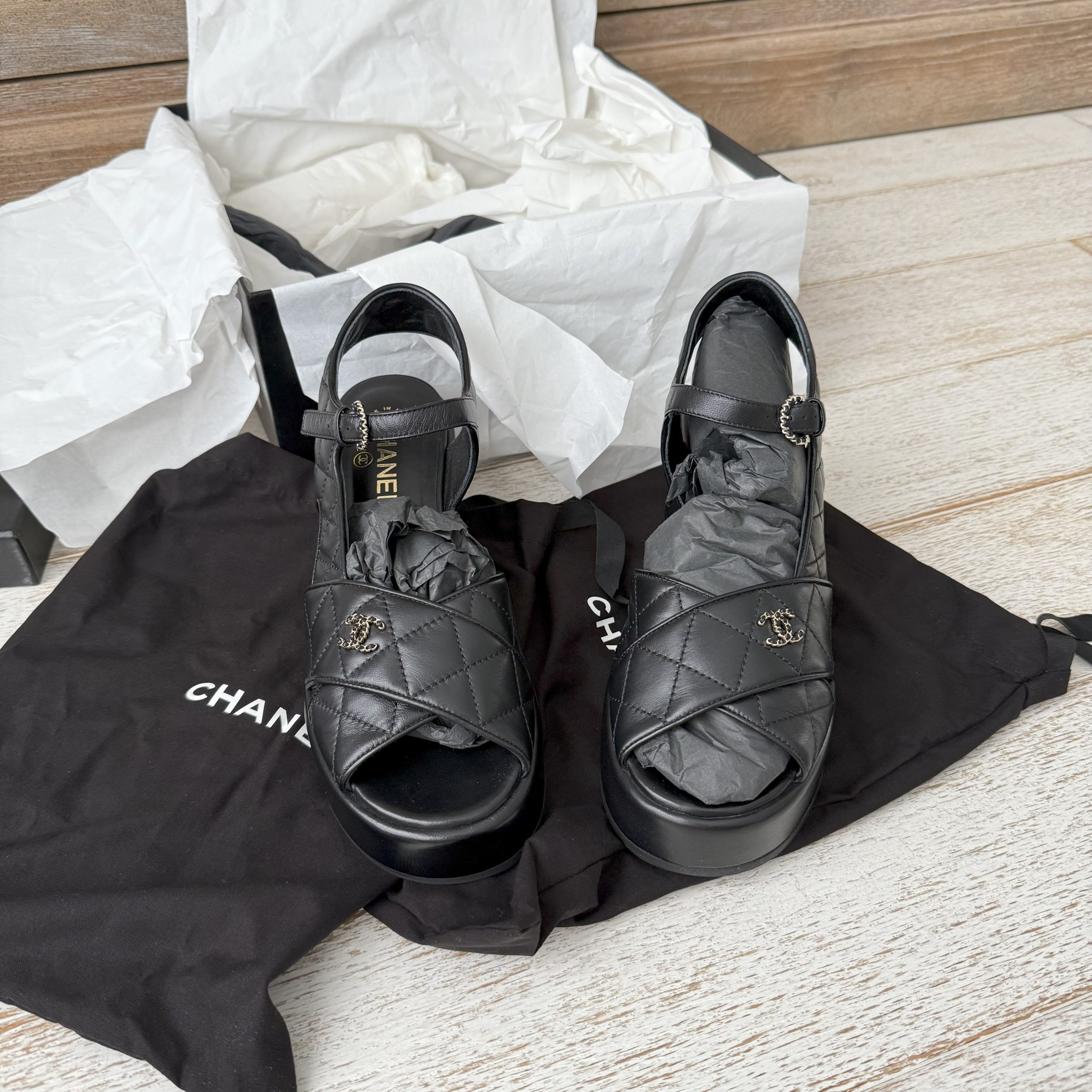 Chanel Black Quilted Lambskin Leather CC Platform Sandals. G39918. Size 40. US size 10. These run a half size small. Black quilted lambskin leather with gold & black CC logo. 2.75″ platform. Buckle closure. Made in Italy. Brand new with box.
