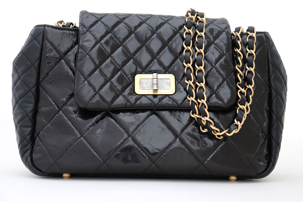 Chanel Black Quilted Leather Mix Reissue Accordion Flap Bag. From Chanel’s Fall 2011 collection. Features glazed crinkled leather, smooth leather sides, aged silver and aged gold-tone hardware, reissue clasp, studs to protect the base and textile lining with zippered pocket, flat pocket, cell pocket and accessory attachment. Measures approx. 11″ across base x 7.5″ x 3.5″. Made in Italy. Hologram/Authenticity: 15489052. This bag is in like new condition. There are a few minor marks on the interior lining. Comes with box, dust cover, tag still attached, booklet and authenticity card. Retailed for $3000.