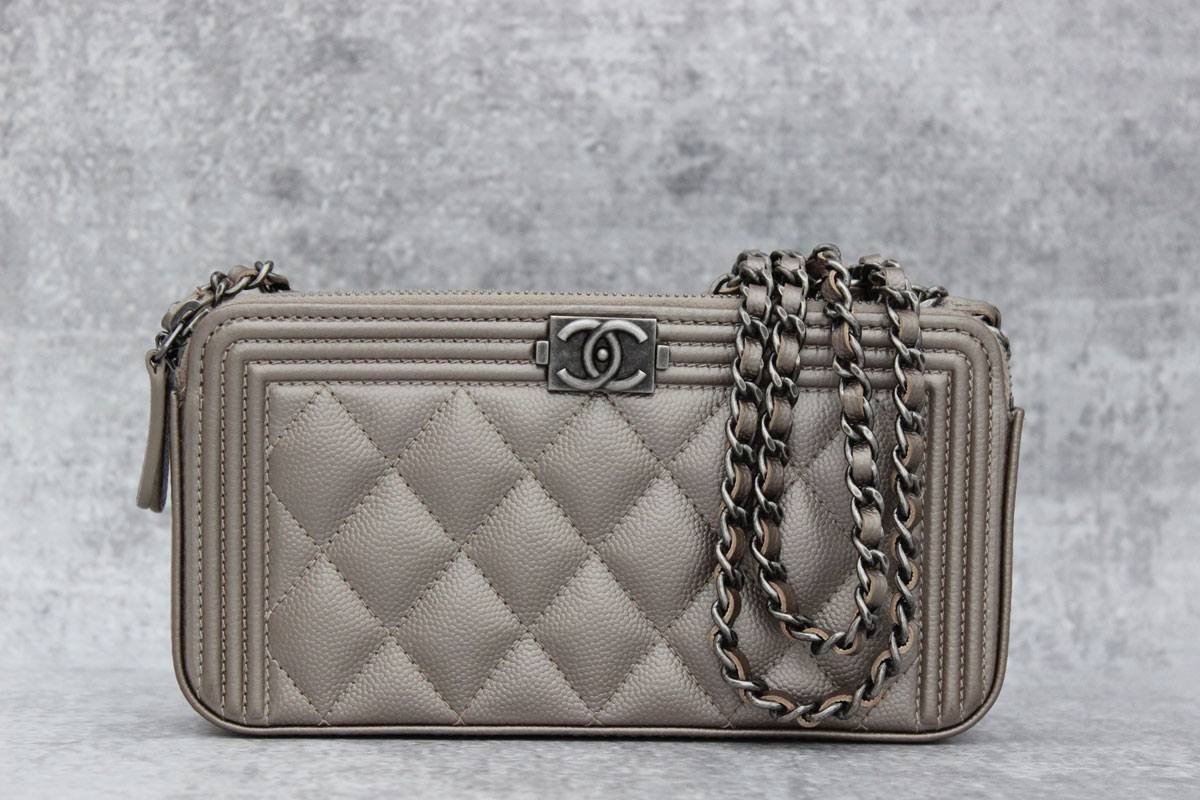 This Chanel Boy clutch with chain features quilted caviar leather in a copper shade with ruthenium hardware, detachable chain with 24″ drop, center open compartment and two zippered compartments each having three card slots. Measures 7.5″ x 3.9″ x 1.6″. Made in Italy. Hologram/Authenticity: 24779317. There are two light marks on the lining in one of the zippered compartments (see last photo). This boy clutch is otherwise pristine and comes with authenticity card, dust cover and box.