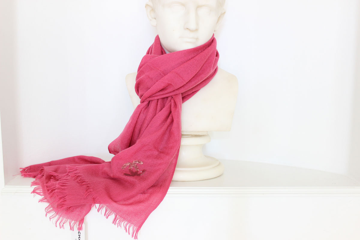 Chanel Cashmere Sequins CC Stole Dark Pink. Sequined CC logo. Fringed edges. 100% cashmere. Measures approx. 84″ x 32″. Made in Italy. New with tags attached and Neiman Marcus box.