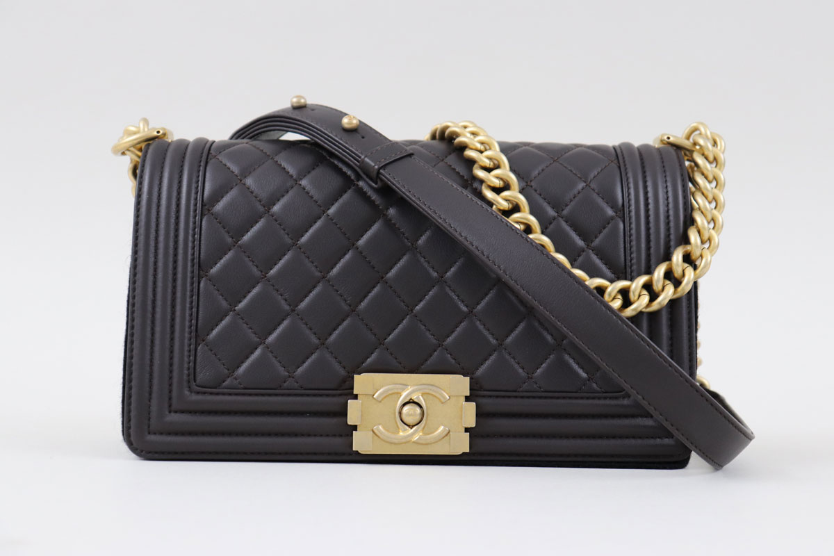 Chanel Dark Brown Old Medium Calfskin Boy Bag. Dark brown quilted calfskin leather with lightly aged gold-tone hardware. Measures 9.8″ x 5.9″ x 2.75″ (not including flap depth). Made in Italy. Hologram/Authenticity: 25865939. This bag is in new condition and comes with dust cover, protective felt and authenticity card. Protective plastic still covers interior hardware.