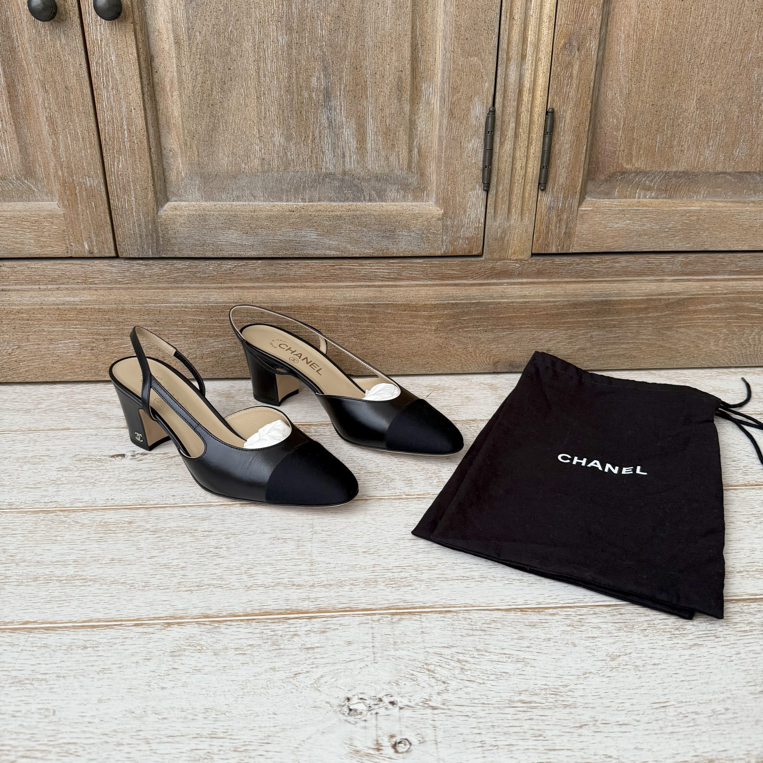 Chanel black goatskin and grosgrain slingback heels. G31318. Black goatskin with black grosgrain cap toe. Small CC logo on heel. Size EU40 US10. 2.6 inch heel. Brand new. No box. Will come with two dust covers.