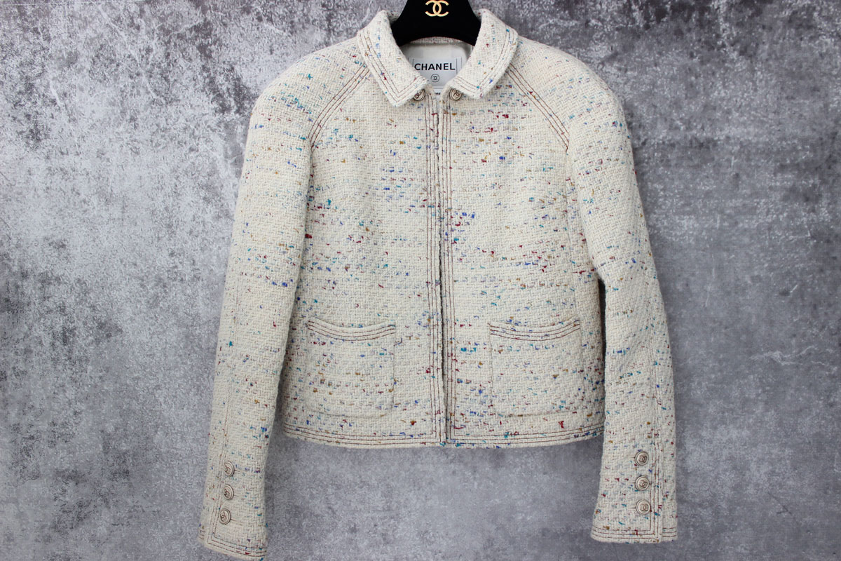 Chanel 03C Collection Short Wool Boucle Jacket. Size 34. Fits US size 0/2. Beige with multicolor threading throughout. Single chain-button closure at neck. Three CC buttons at each sleeve. Ivory camellia silk lining with chain. Style: P20328 V11549. Made in France. Perfect, pristine, impeccable condition. Comes with extra fabric swatch, extra button, extra lining swatch and threading.