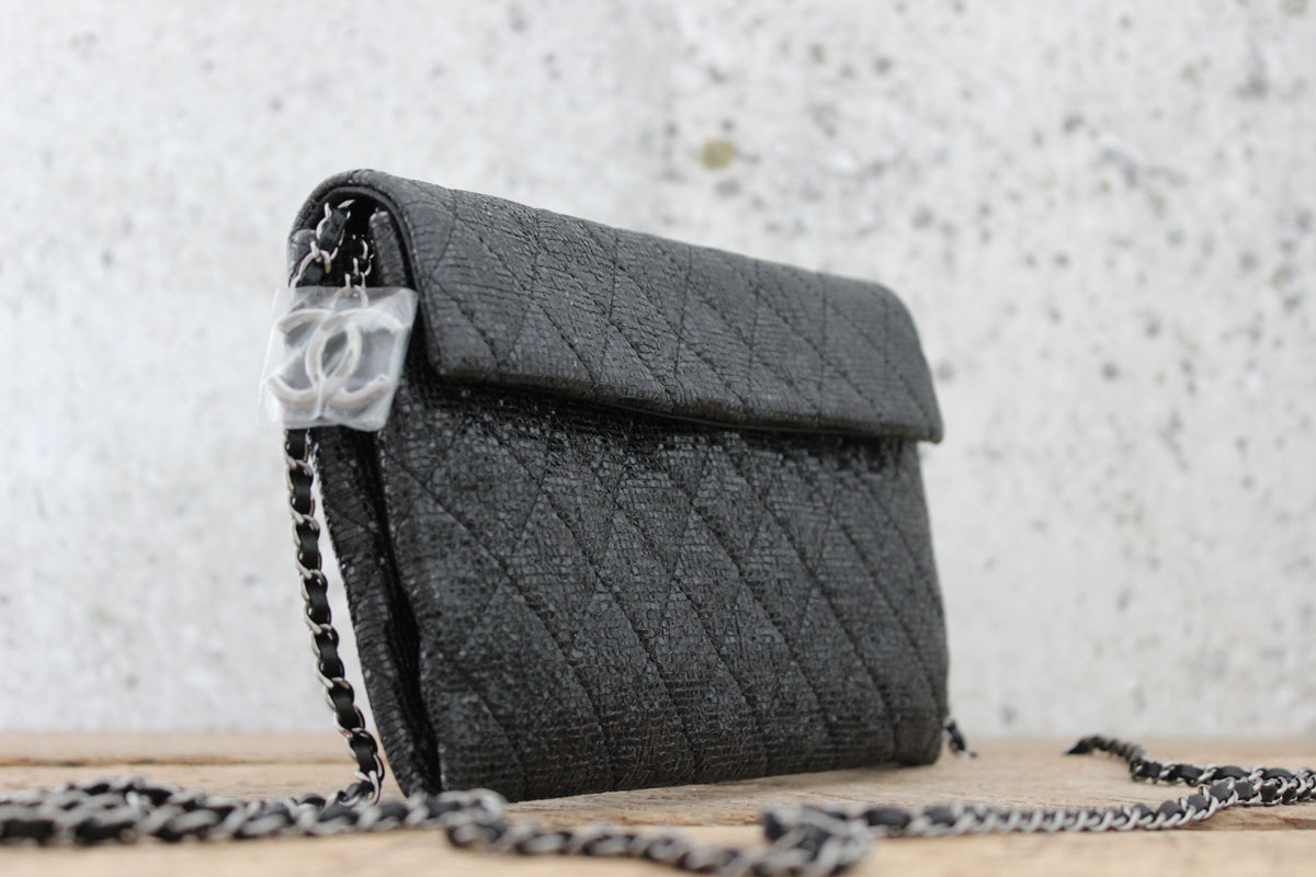 Chanel Metallic Quilted CC Charm Crossbody Bag. This bag is brand new. Comes with box, Chanel book, dust cover and authenticity card. It was available to select Chanel customers during the December 2014 holiday season. Black metallic quilted material with dark silver CC logo charm and a dark silver and black leather woven chain strap with 25.5″ drop. Short flap with magnetic snap closure and additional zipper closure for main compartment. Black satin lining with two slip in pockets. Hologram/Authenticity: 20417598. Measures 8.75″ x 5.5″. Made in Italy.