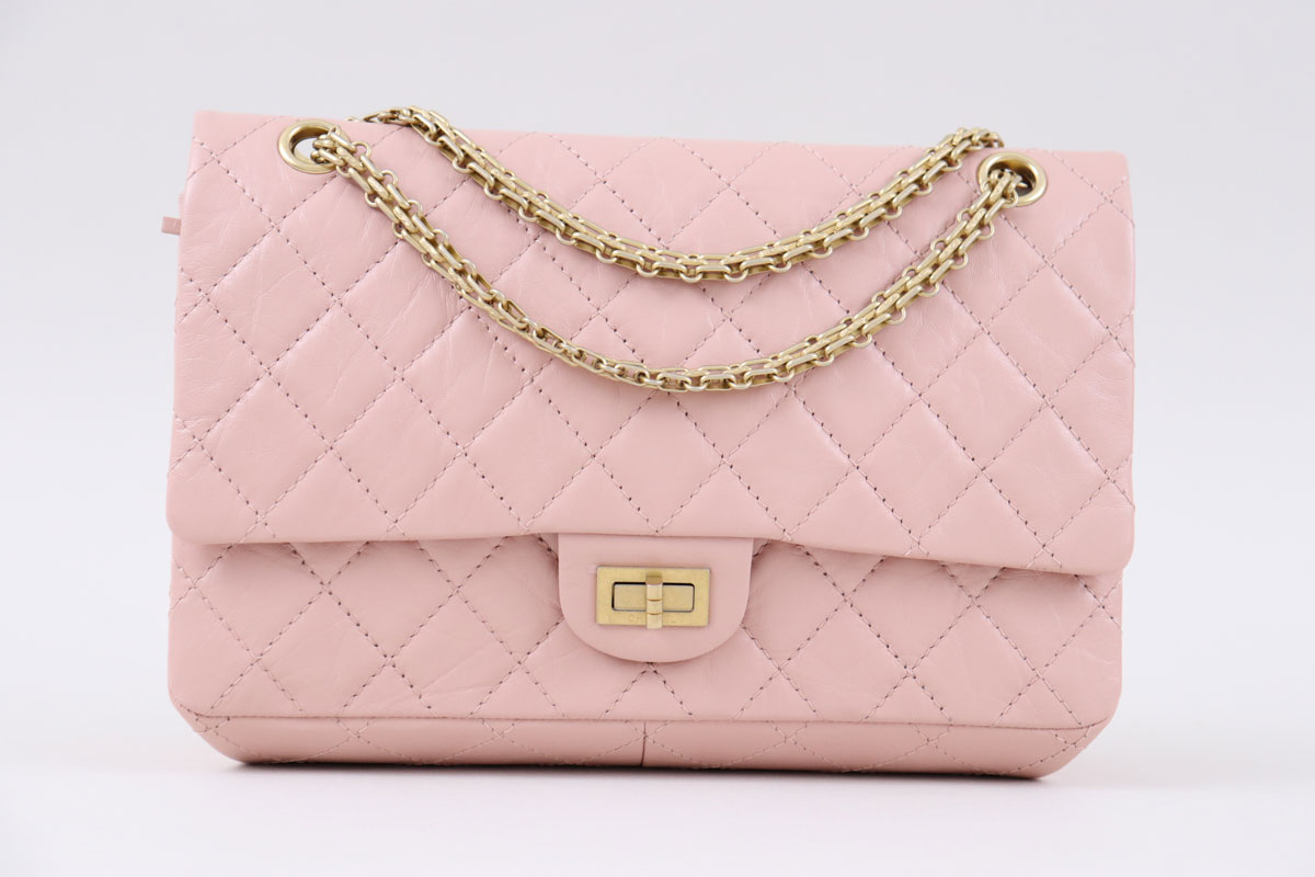 Chanel Pink Aged Calfskin 2.55 Reissue Double Flap Bag. 19P Collection. Pink aged calfskin, antiqued gold-tone hardware, double flap, bijoux chain double strap and Mademoiselle clasp. BRAND NEW. Comes with dust cover and authenticity card. Protective plastic still covers the hardware and original tissue still inside. Measures 10.75″ x 7″ x 3″. Made in France. Hologram/Authenticity: 27329744.
