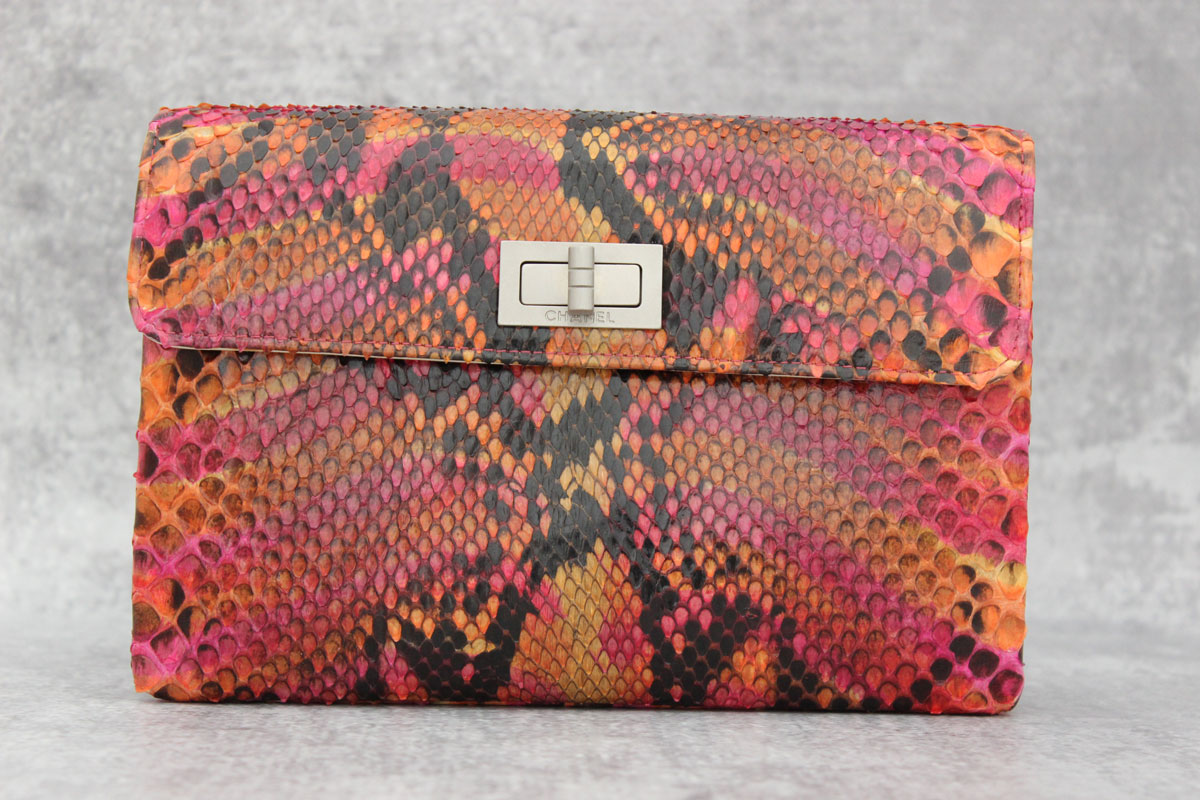 Chanel Pink Multicolor Python Clutch. This bag features pink & multicolor python snakeskin with silver-tone Mademoiselle clasp, a handle on the back and leather lining with two compartments and a zippered pocket. Made in Italy. Measures 8.25″ x 5.25″ x 1″. Hologram/Authenticity: 6112297. This bag was carried one time and is in mint condition. Comes with box, protective felt, authenticity card and original tag. Year 00T (2000 transition collection).