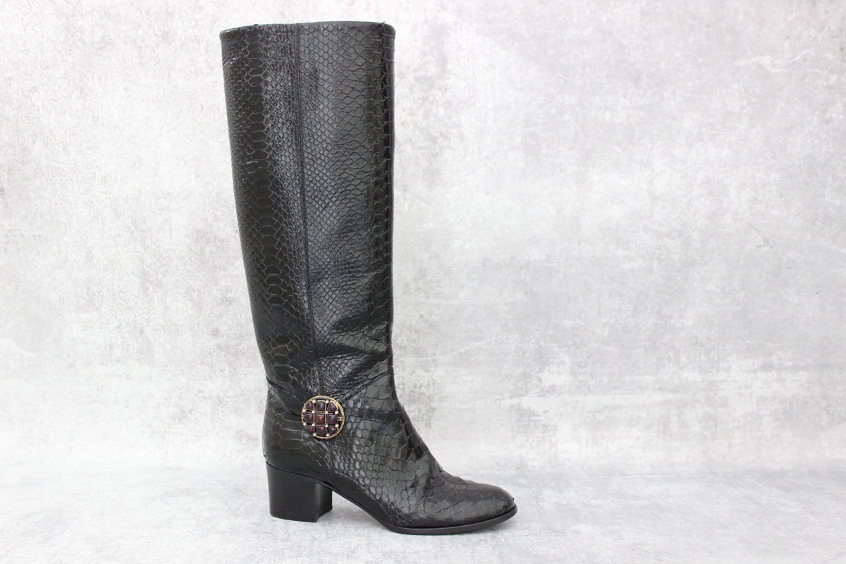 Chanel black python embossed leather boots. Size 7.5. Knee-high. Pull on. 2″ block heel. Size 37.5. Made in Italy. Jeweled brooch detail at ankles. Rounded toe. Leather lining. VERY gently worn.