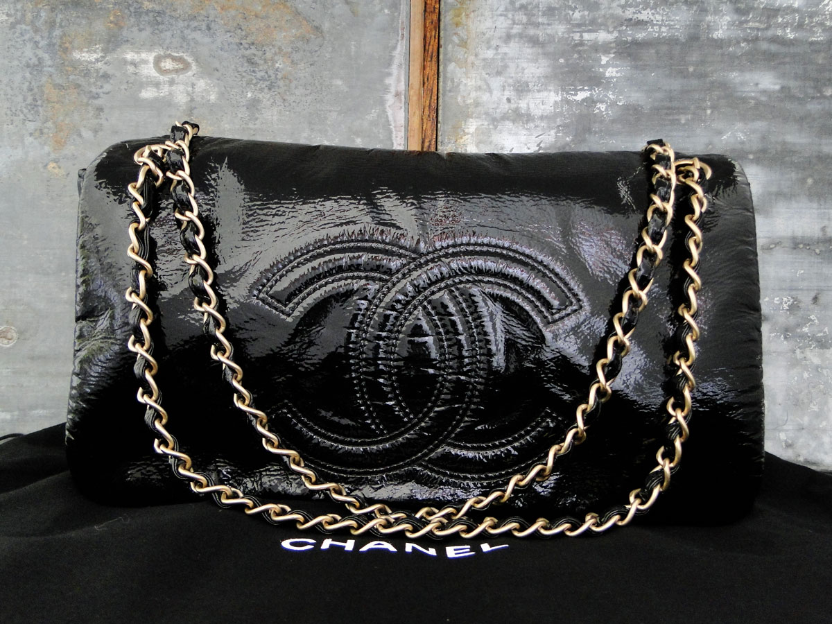 Chanel Black Vinyl ROCK & CHAIN Flap Bag. Features shiny black vinyl with CC logo on the front flap, matte gold-tone hardware, magnetic snap closure under flap and satin lining with zippered pocket. Hologram/Authenticity: 11478888. Made in France. Measures 11.5″ x 7″ x 2 1/4″. The straps have a drop of 8″. This bag is in PERFECT condition on the exterior (zero signs of use). It has some very, very light marks on the interior lining. It comes with dust cover, booklet and authenticity card. This bag can be put on a four month layaway for $331.25.