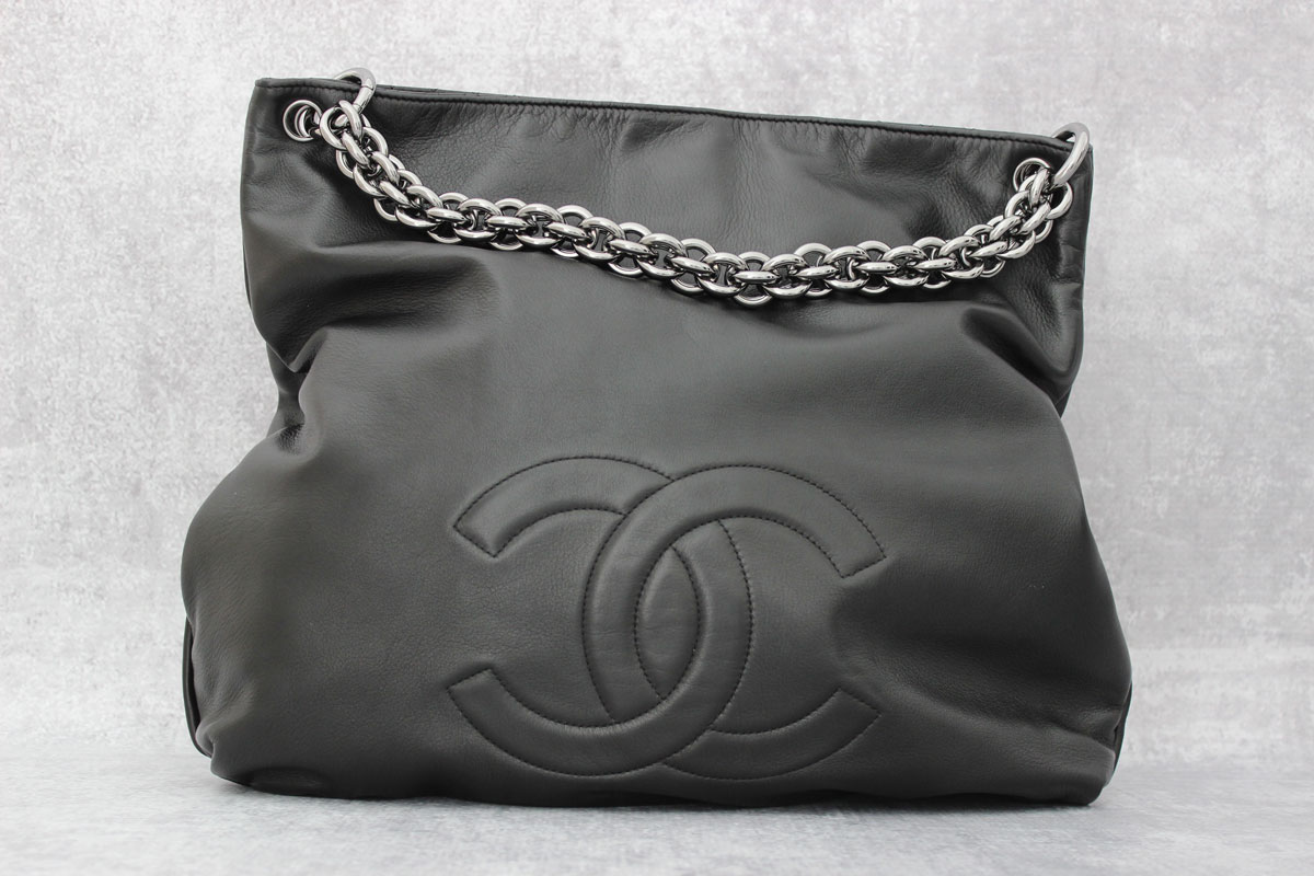 Chanel Black Lambskin Soft and Chain Hobo. This bag features black smooth lambskin leather with chunky silver chain strap and stitched CC logo. Interior magnetic snap closure and black satin lining with zippered pocket, flat pocket and cell pocket. Measures approx. 15″ x 15″ x 3″. Made in Italy. Hologram/Authenticity: 11688983. This Soft and Chain hobo is in excellent (as new) condition and comes with dust cover.
