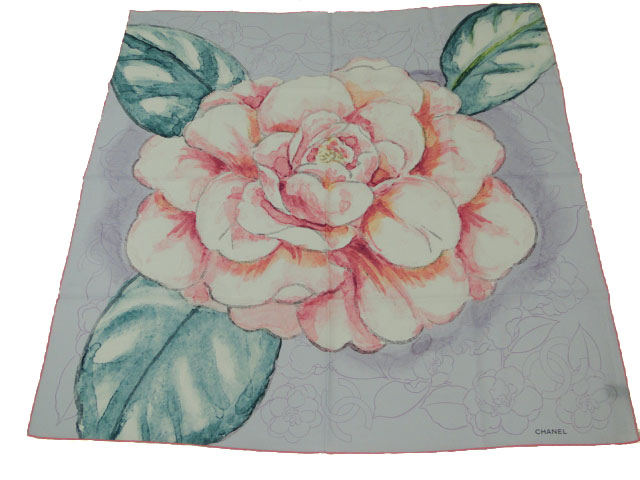 Watercolor silk scarf with large camellia motif and CC logos. 13P collection. Pastel print with pink hand-rolled edges. 100% silk. 35″. Made in Italy. This scarf is in NEW condition.