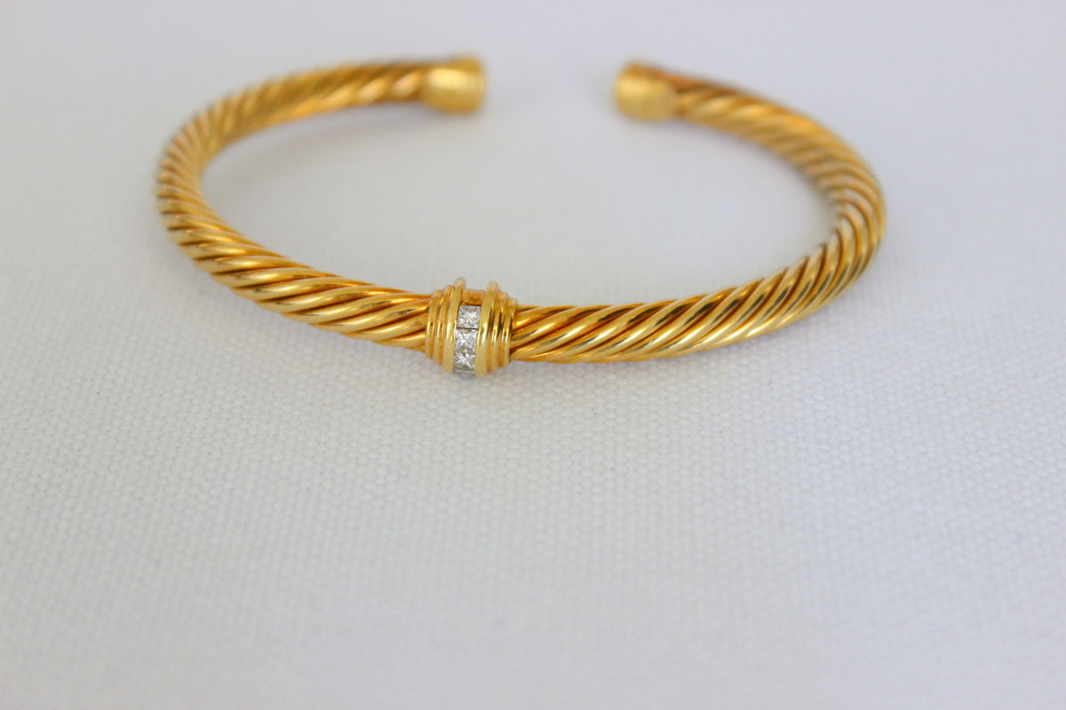 David Yurman 18K YG Diamond Cable Cuff. 5mm. Single diamond station. Hallmarked D.Y. 750 at both ends. Four diamonds at center station. This cuff needs cleaning (more so near the ends) but is otherwise perfect. No dings or dents. Once cleaned it should look as good as new. No pouch or box but will be packaged with care.