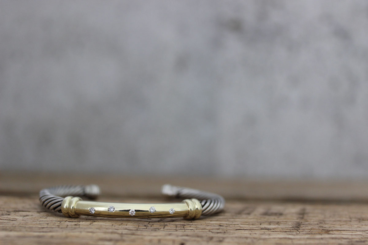 David Yurman 5mm Cable Diamond METRO Bracelet. 5mm sterling silver cable and 14k gold bar with five diamonds. Hallmarked 585 925 D.Y. Needs polishing. No pouch. Size large.