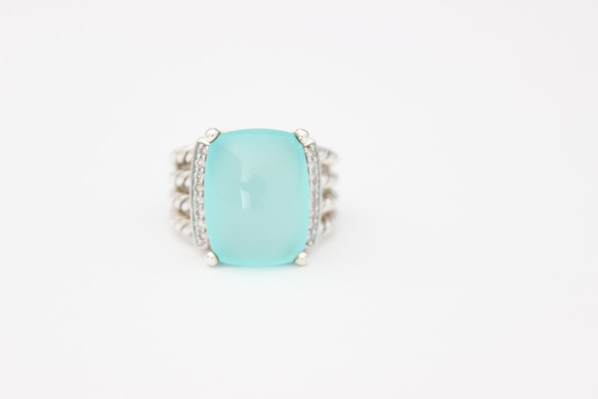 David Yurman Aqua Chalcedony & Diamond Wheaton Ring. Cabochon Aqua Chalcedony. Pave diamonds. 0.16 TCW. Sterling Silver. 16mm x 12mm. Size 7.5. This ring is in excellent condition. No scratches or scuffs but does need cleaning. No box or pouch.
