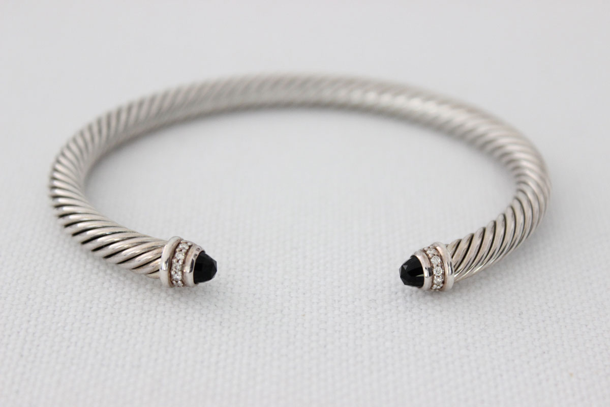 David Yurman Cable Classics Black Onyx Diamond Cuff. Sterling silver & faceted black onyx with pave diamonds totaling 0.07. 5mm wide. Cuff is size medium and measures approx. 6.25″ circumference. Opening is approx. 0.75″. Hallmarked D.Y 925. In excellent condition. No pouch but will be packaged with care. Current retail on this cuff is $625.