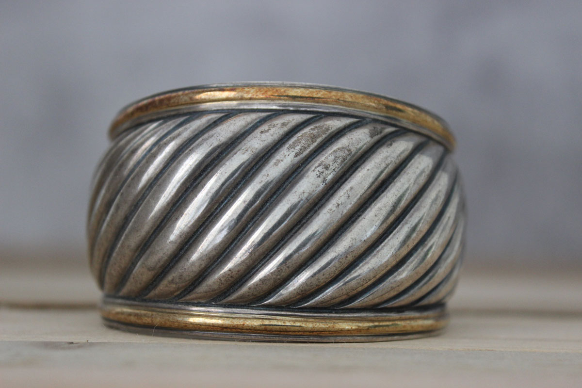 David Yurman Carved Cable Wide Cuff Bracelet. Sterling silver & 18k yellow gold. Hallmarked DY 925 750. Condition: VERY, VERY TARNISHED. NEEDS PROFESSIONAL POLISHING/CLEANING. No pouch. Will be packaged with care.