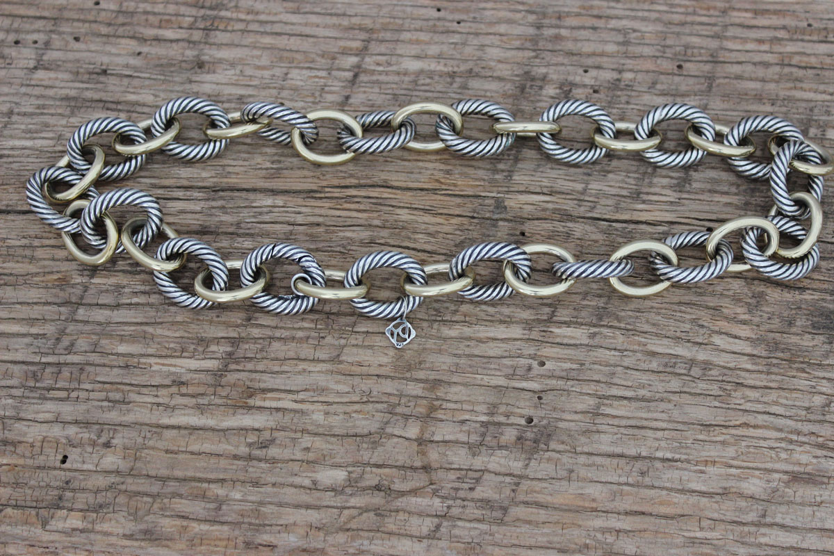David Yurman Extra Large Oval Link Chain Necklace 18.5″. This necklace measures 18.5″ long. It has 18 sterling silver cable links measuring approx. 17 x 22mm. It has 18 smooth, bonded 18kt. yellow-gold links measuring approx. 16 x 20mm. It has a sterling silver DY hangtag hallmarked 925. 925 1/4 750 is hallmarked inside the clasp. Total weight = approx. 128.3 grams. It could use polishing but looks to be in excellent condition. We do not have the pouch or box.