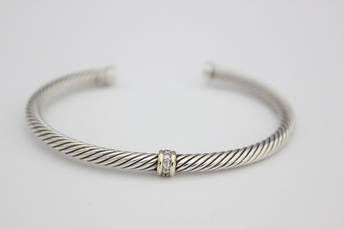 David Yurman 4mm Pave Diamond Cable Cuff Bracelet. Sterling silver & 18kt yellow gold. Some light scratches & some light tarnishing. No pouch but will be packaged with care.