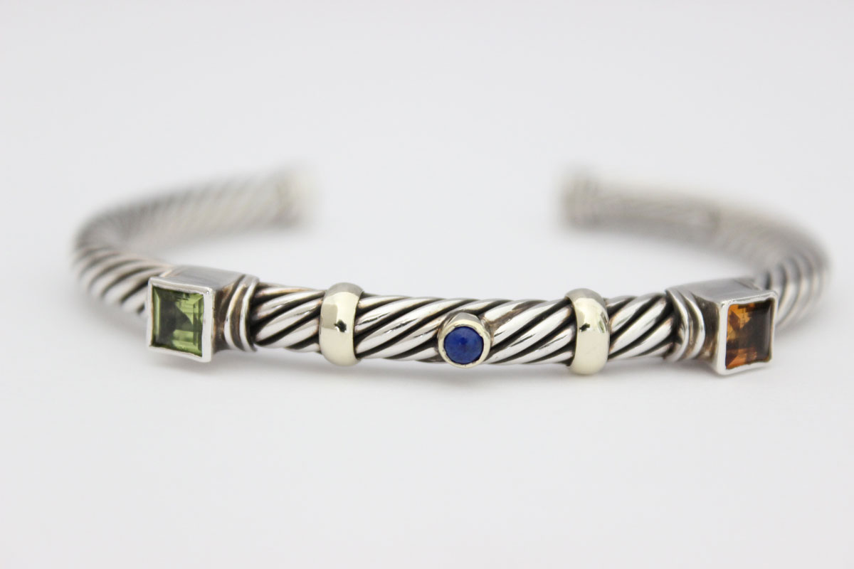 David Yurman sterling silver & 14kt yellow gold Renaissance collection cable cuff. Peridot, Lapis and Citrine. Light tarnishing but otherwise excellent. No pouch. Will be packaged with care.