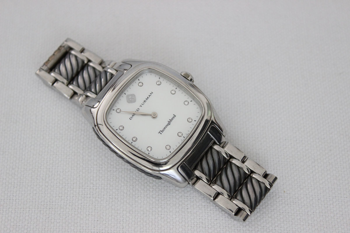 David Yurman Stainless Steel Thoroughbred Watch. T303 SST B-03709. Mother of pearl dial. Diamond markers. DY crown. 3 ATM water resistant. Deployment clasp. Cable links needs cleaning. Crystal has no scratches. Fits a 6.5″ wrist perfectly.
