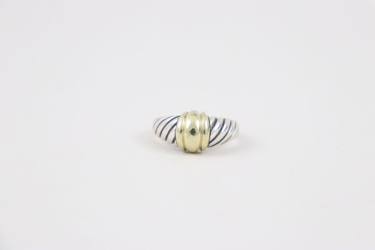 David Yurman vintage Shrimp ring. Size 9. Sterling silver and 14kt yellow gold. Could use professional cleaning. No pouch or box.