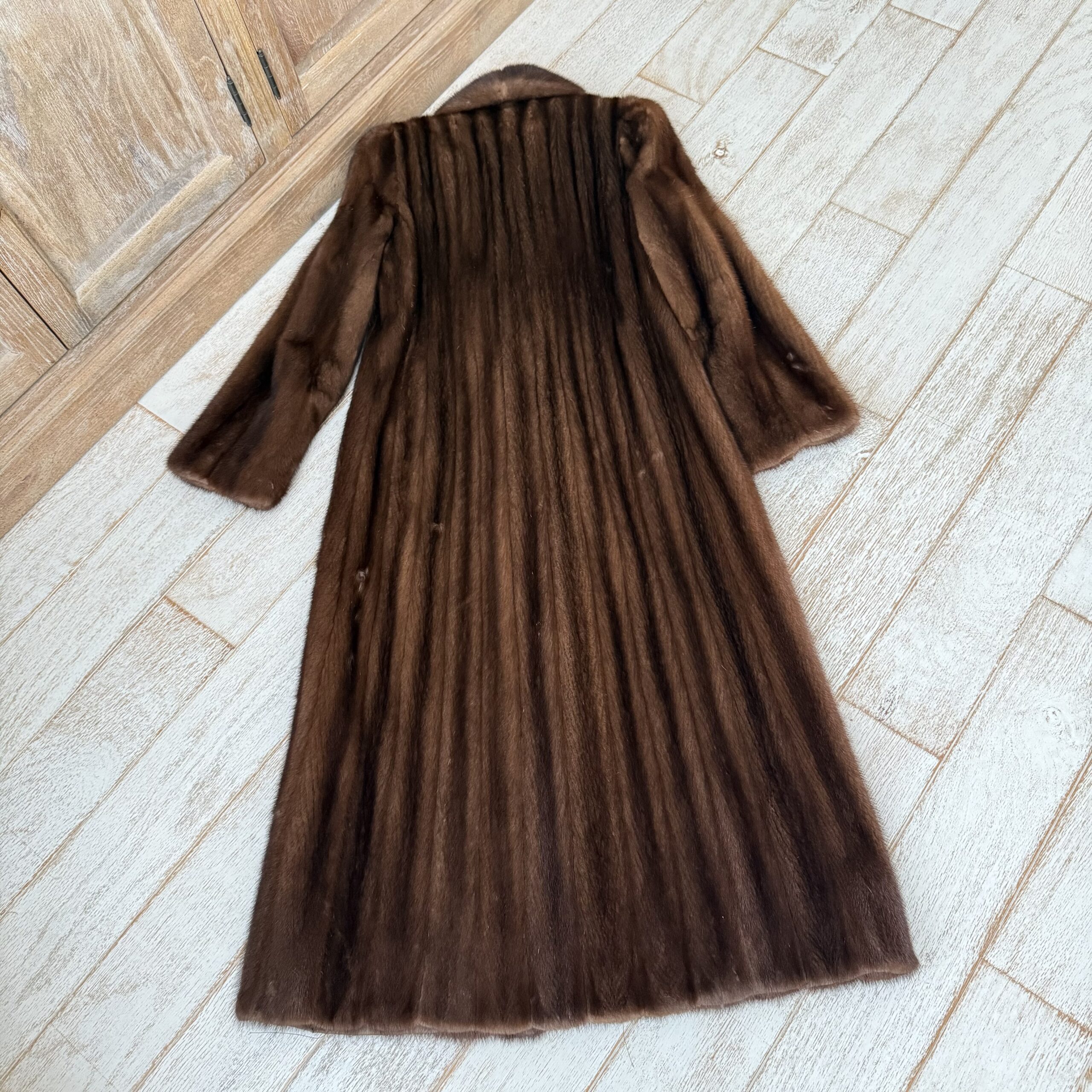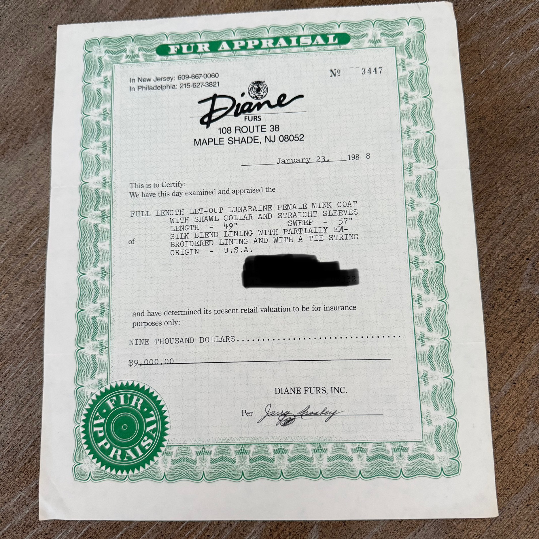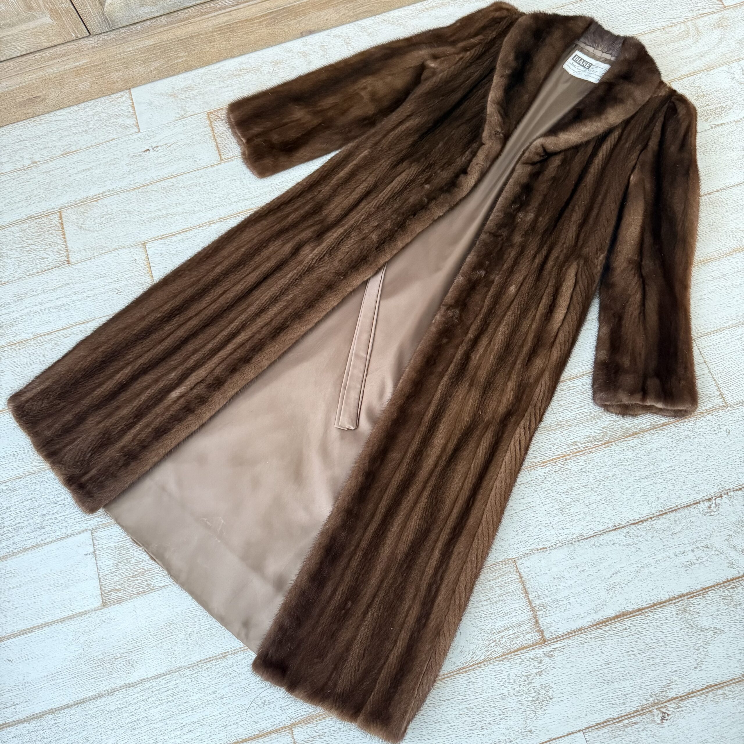 Diane Furs Full-Length Mink Coat. Approx. size 4. Full-length female mink with shawl collar and straight sleeves. Length 49”. Sweep 57”. Silk-blend lining with embroidery and tie string. Two front closures. Made in USA. Will come with appraisal from 1988. Has been kept in cold storage. This fur coat is in exceptional condition.