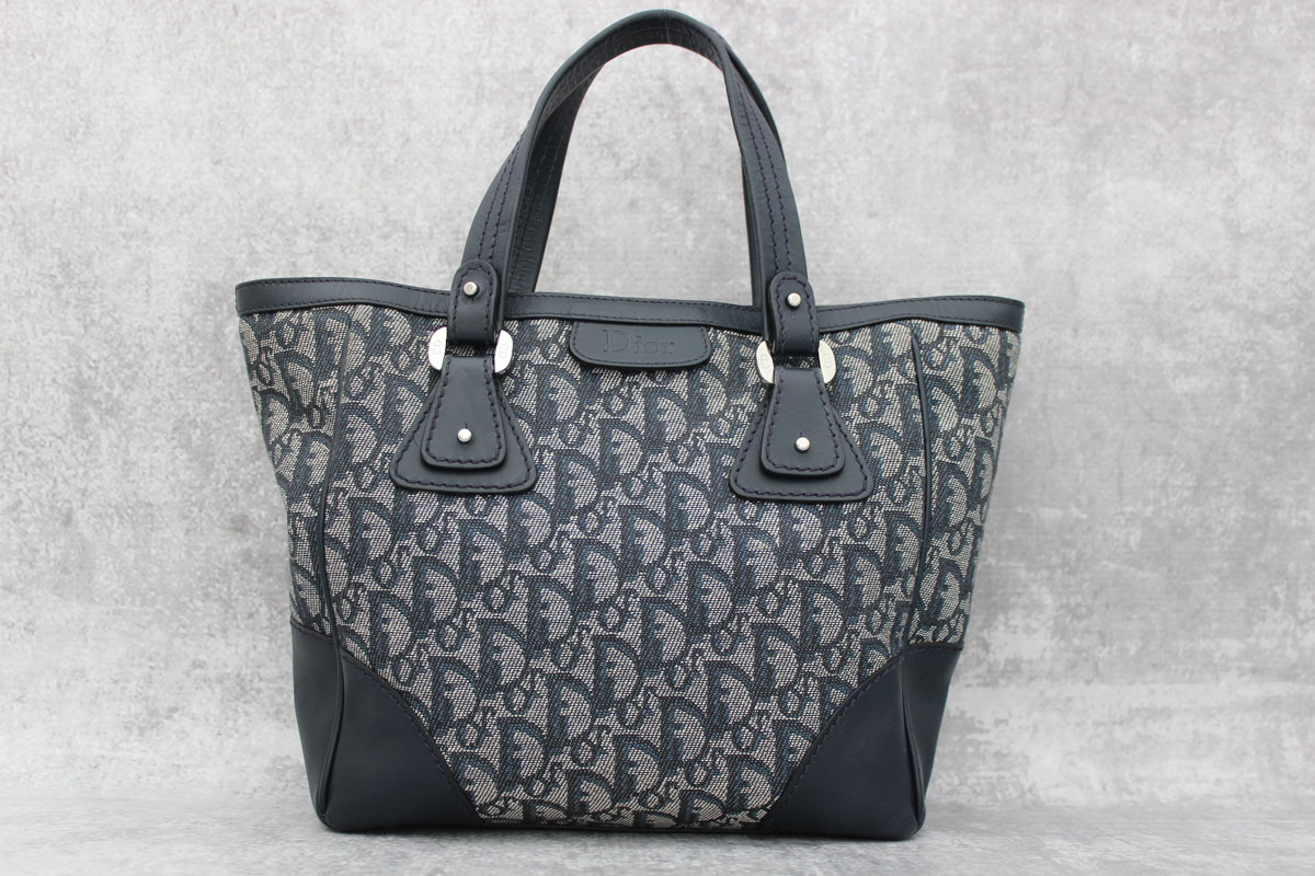 Dior blue monogram small tote. Blue smooth leather trim and CD engraved hardware. Zip-top. Nylon lining with zippered pocket and two open pockets. Straps have a drop of 5″ to top of bag. Measures 13″ across the top (9.5″ across the base) x 9.5″ tall x 3″ wide. Made in Italy. Serial/Authenticity: 02-B0-0045. There are some scuffs to the leather trim. No marks on the monogram canvas. The interior is clean. No dust cover but will be packaged with care.