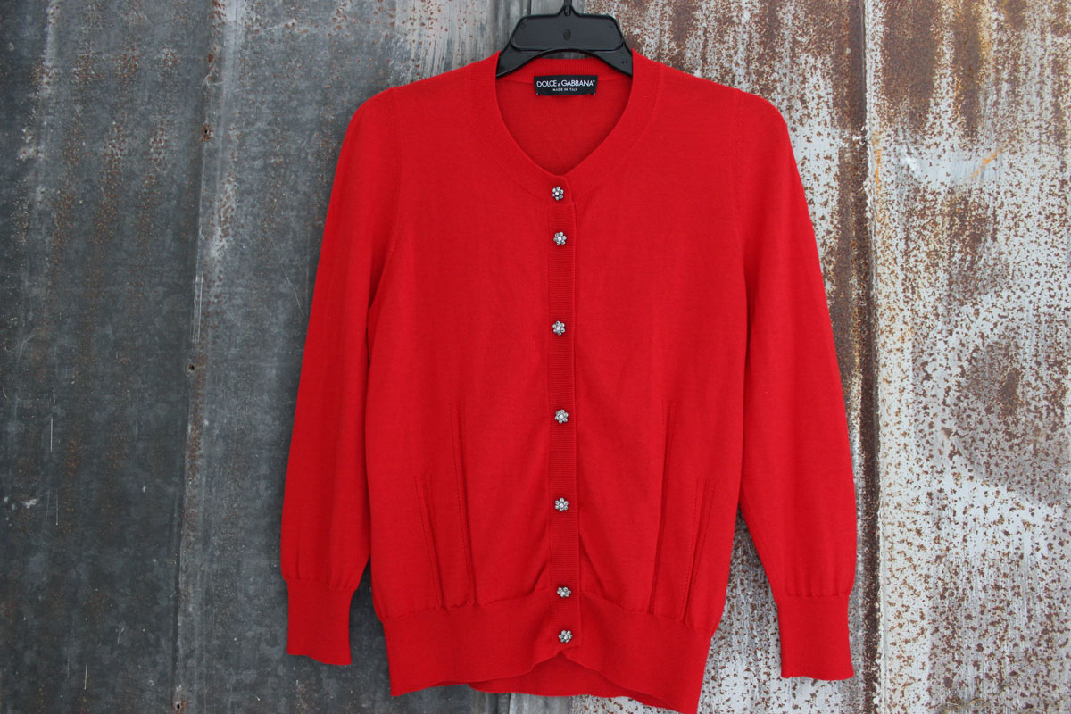 Dolce & Gabbana Red Cashmere & Silk Knit Cardigan. Size Small. Crystal buttons up the front. Ribbed trim. Made in Italy. This cardigan is in PRISTINE condition.