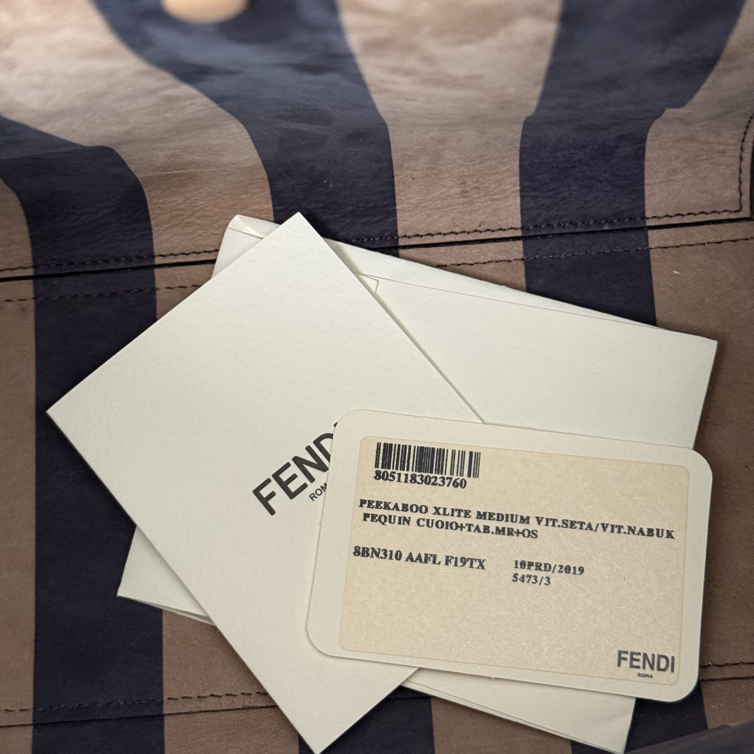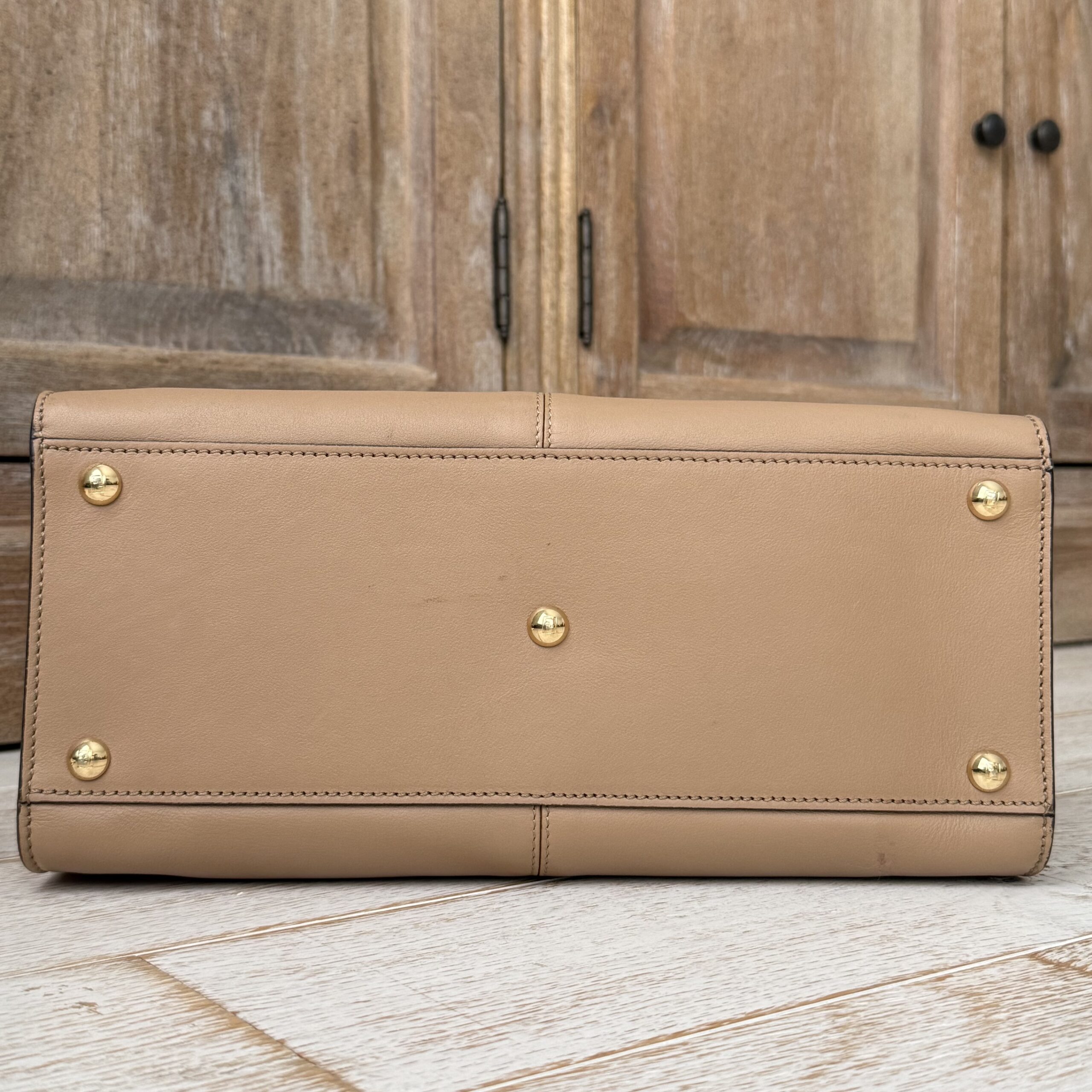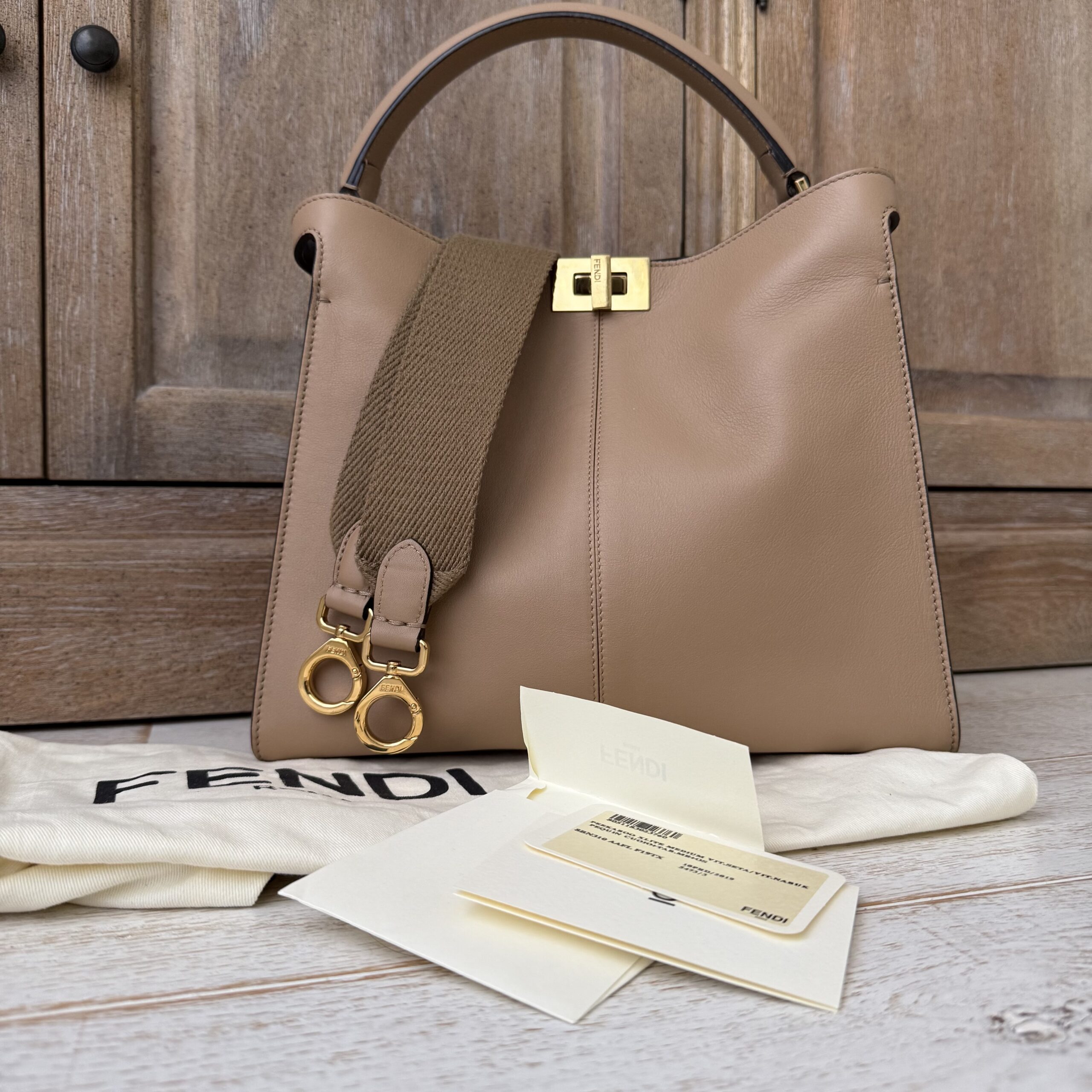 Fendi 8BN310 Peekaboo XLite Medium Beige. Features beige calfskin leather, gold-tone hardware, top handle, detachable canvas shoulder strap, and nubuck Pequin lining with snap pocket. Fendi turn lock closure and FF engraved studs to protect the base. Measures approximately 11 3/4” x 10” x 5 1/2”. Made in Italy. 8BN310 AAFL 208 12085. The closure hardware shows scratches and smudges. There is a small mark on one side of the bag. Some light marks on the base. Some light marks on the interior. Otherwise excellent. Comes with dust cover.