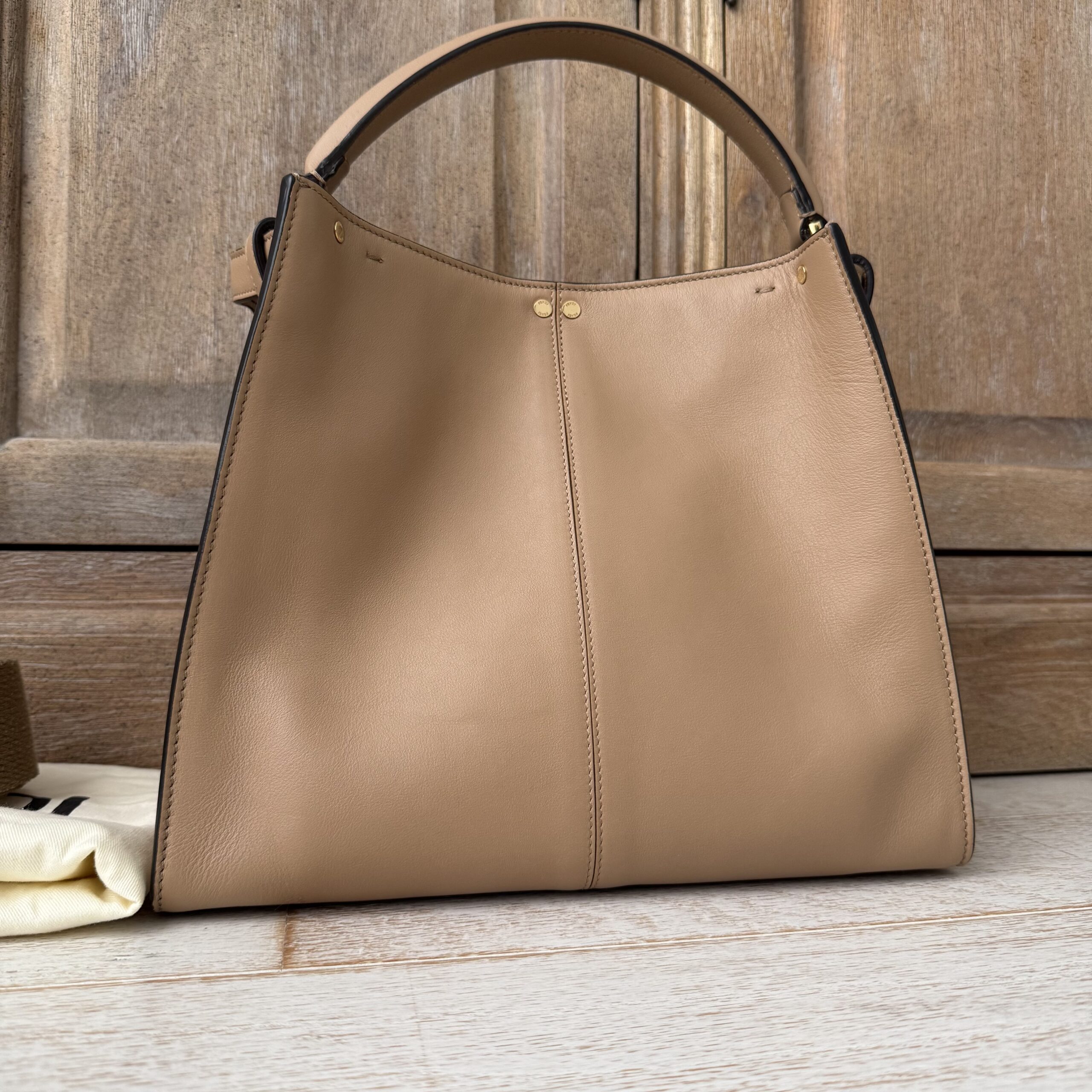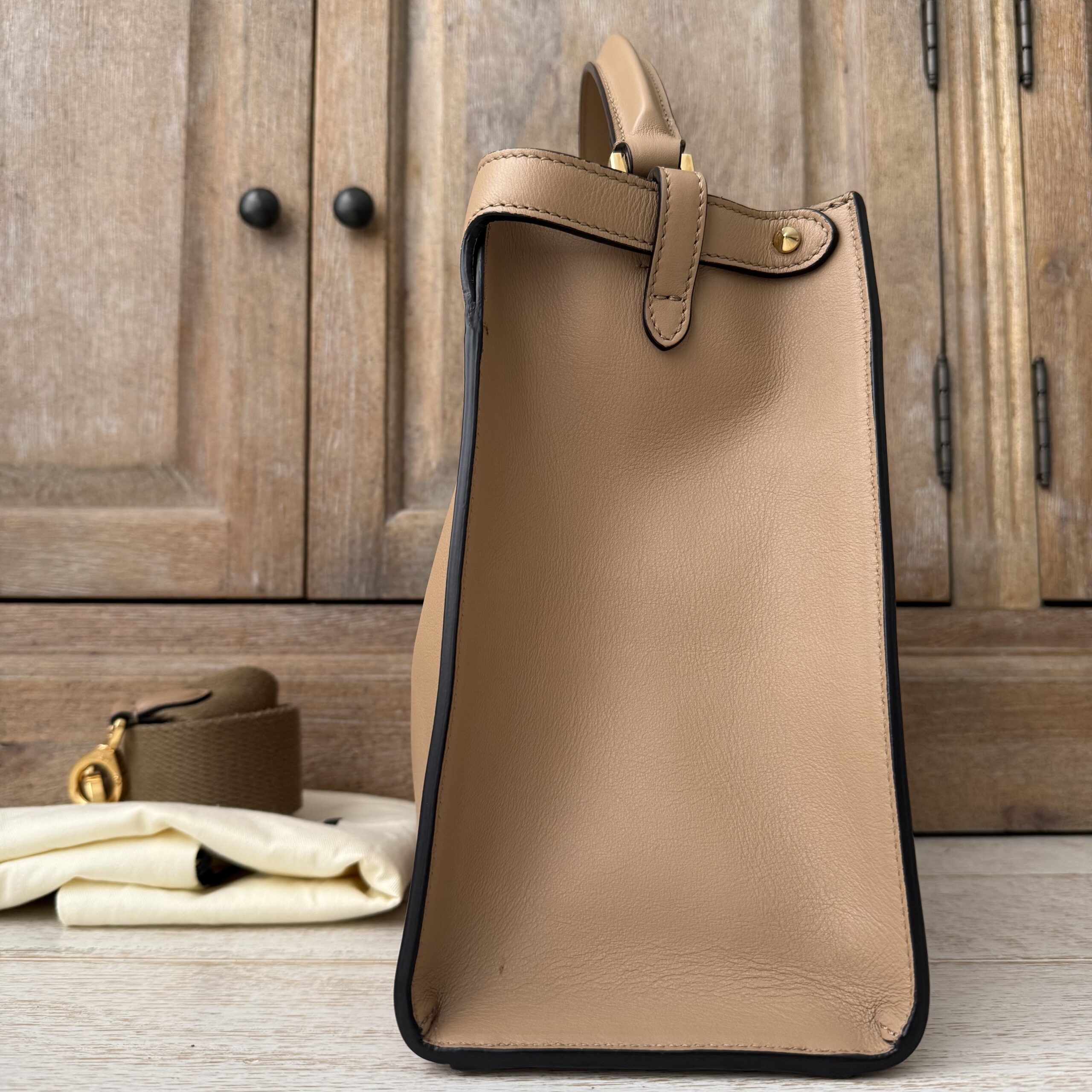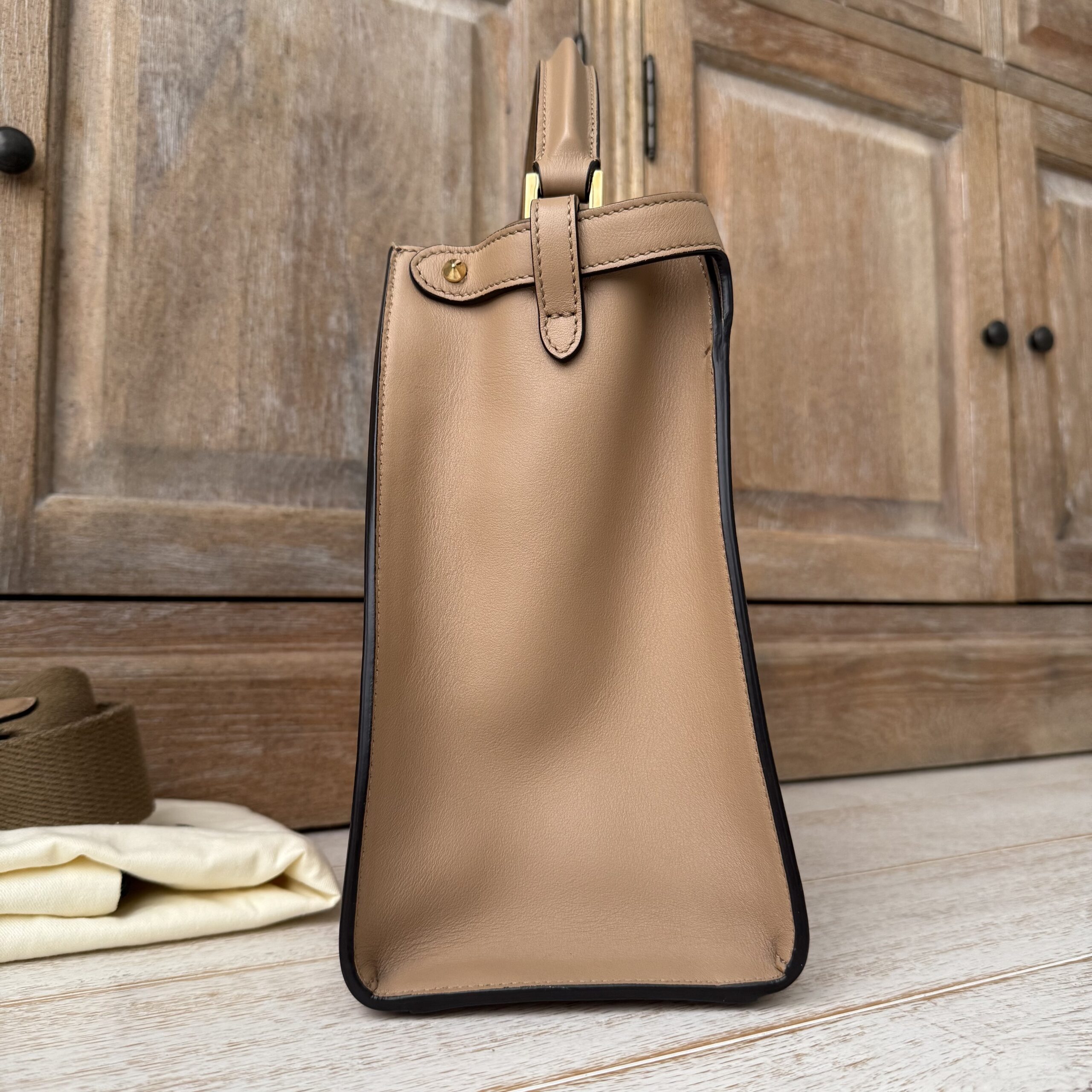 Fendi 8BN310 Peekaboo XLite Medium Beige. Features beige calfskin leather, gold-tone hardware, top handle, detachable canvas shoulder strap, and nubuck Pequin lining with snap pocket. Fendi turn lock closure and FF engraved studs to protect the base. Measures approximately 11 3/4” x 10” x 5 1/2”. Made in Italy. 8BN310 AAFL 208 12085. The closure hardware shows scratches and smudges. There is a small mark on one side of the bag. Some light marks on the base. Some light marks on the interior. Otherwise excellent. Comes with dust cover.