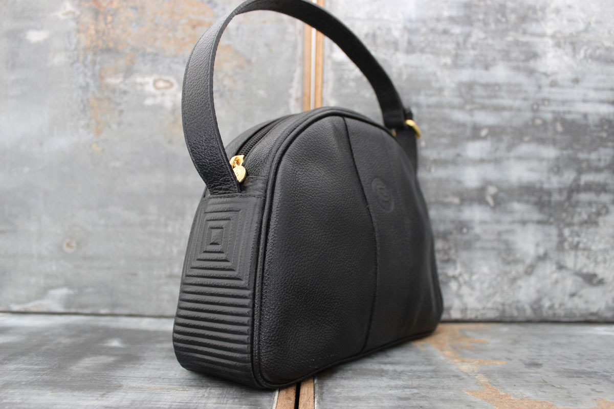 Fendi Vintage Black Leather Shoulder Bag. This vintage Fendi is from the 80’s. It was never carried. It is in perfect condition. Beautiful exterior and magnificent interior. Any light areas you may see are from the lighting reflecting on the full-grain leather which has a bit of a sheen to it in certain lights. Rounded at the top. Zip closure with signature zipper pull. Fendi logo embossed at the front. Short leather strap with 5.5″ drop. The strap is short so the bag can only be carried on the elbow or by hand. Black leather lining with zippered pocket. Serial/Authenticity: 43380917039. Made in Italy. Measures 10″ x 7″ x 3″.