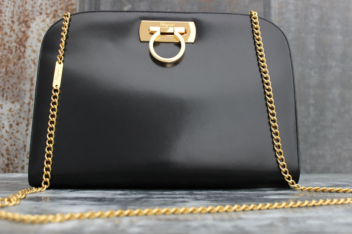 Ferragamo Black Smooth Calfskin Gancini Chain Shoulder Bag. Wear it on the shoulder or remove the detachable chain strap to carry as a clutch. This bag is in beautiful condition and comes with dust cover. Measures 11″ x 8″ x 2.5″. The chain strap has a drop of 21″. The interior is lined in black Ferragamo lining and has a zippered pocket. Made in Italy. Style/Serial: P 21 0587.